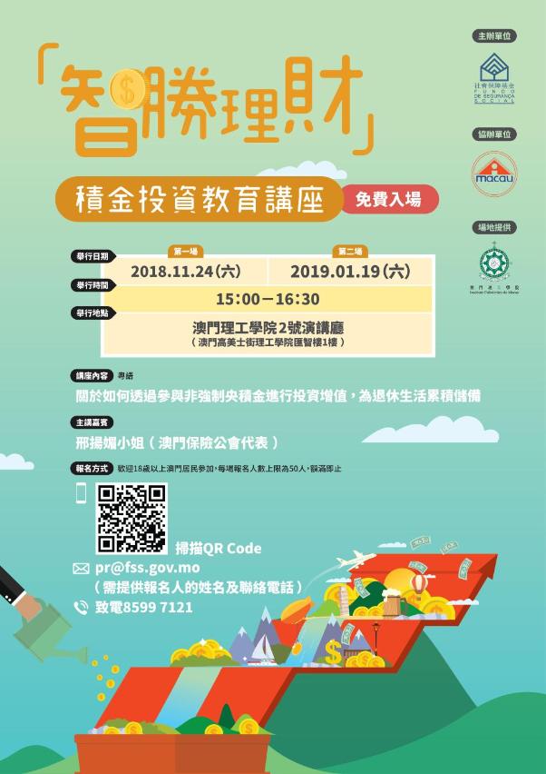 由社会保障基金主办、澳门保险公会协办的“智胜理财”积金投资教育讲座,将于1月19日(周六)下午3时至4时30分假理工学院举行,主讲嘉宾是澳门保险公会代表邢扬媚,届时将介绍如何透过参与非强制央积金进行投资增值、为退休生活累积储备的理财策略。活动详情如下: