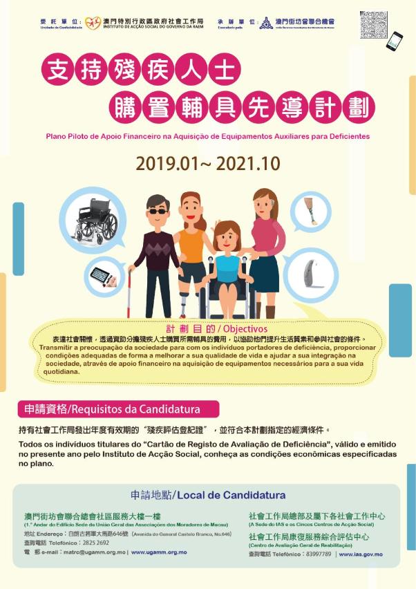 「支持残疾人士购置辅具先导计划」实施日期由2019年1月1日至2021年10月30日止。申请者须持有社会工作局发出年度有效期的“残疾评估登记证”,并符合本计划指定的经济条件。成功申请者将获资助每项辅具购置费用的50%(包含所需的运费),每位申请者限于实施期间累计最多三项辅具资助,每项最高资助金额上限为澳门币1万元正。有关本计划详情,可浏览社会工作局网页www.ias.gov.mo。申请者须填妥申请表及带同所需文件,前往社会工作局总部及属下各社会工作中心、康复服务综合评估中心,或澳门街坊会联合总会社区服务大楼一楼办理(地址:澳门白朗古将军大马路646号)。申请者亦可授权他人或透过所属之社会服务机构代为办理手续,查询致电2825 2692及电邮matrc@ugamm.org.mo与澳门街坊会联合总会,或致电83997789与社会工作局联络。