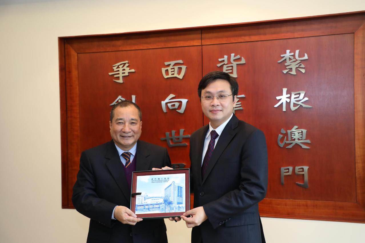 严肇基首先欢迎陈永杰一行的到访,并感谢武术总会一直以来对理工学院的支持。从O八年开始双方携手合作,得到武术总会推荐优秀学生就读理工,无论在校或毕业同学,在武术运动项目成绩突出,为澳门也为母校争光,同时为在读同学树立了良好的榜样。严肇基指出,特区政府重视本澳优秀运动员培养,社会文化司谭俊荣司长十分关心和支持理工学院对运动员的学习和职业生涯规划,支持理工学院加大高端人才培育。理工学院将在今年开办首个体育运动硕士学位课程,并与内地知名大学合办博士学位课程,为年青运动员提供更多更好的学习和训练条件。同时,将与国内外大学加大合作力度,探讨合办高级课程的可能性和灵活性,在师资、学习及场地安排上配合学生的学习生活。此外,冀与武术总会继续加强联系,在开办短期培训课程、活动等方面紧密合作,取得更好的成果。严肇基最后代表理工学院,对理工校友获澳门特区政府授予银莲花荣誉勋章的黄俊华、体育功绩勋章的尤俊贤及李祎再次表示祝贺,祝贺他们在体育事业上取得的成就和作出的杰出贡献,为理工学院增添荣光。