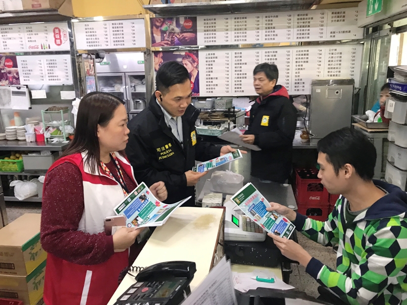 司法警察局持续走访社区进行冬防宣传活动,于1月22日派出刑事侦查人员前往台山区拜访区内团体,就该区的治安情况交流意见。此外,为加强居民的防罪意识,司警局人员还联同大厦防罪之友会员到区内向居民及商铺派发宣传单张,呼吁居民做好家居防盗措施,避免在家里存放大量现金及贵重财物,外出前紧记锁好门窗,并确保防盗设施正常操作;在公众地方,切记财不可露眼,切勿随处乱放手袋、手提电话及展露个人财物等;到人多挤迫地方,紧记保管好个人财物,应将财物置于身前视线范围内,勿让不法之徒有机可乘。