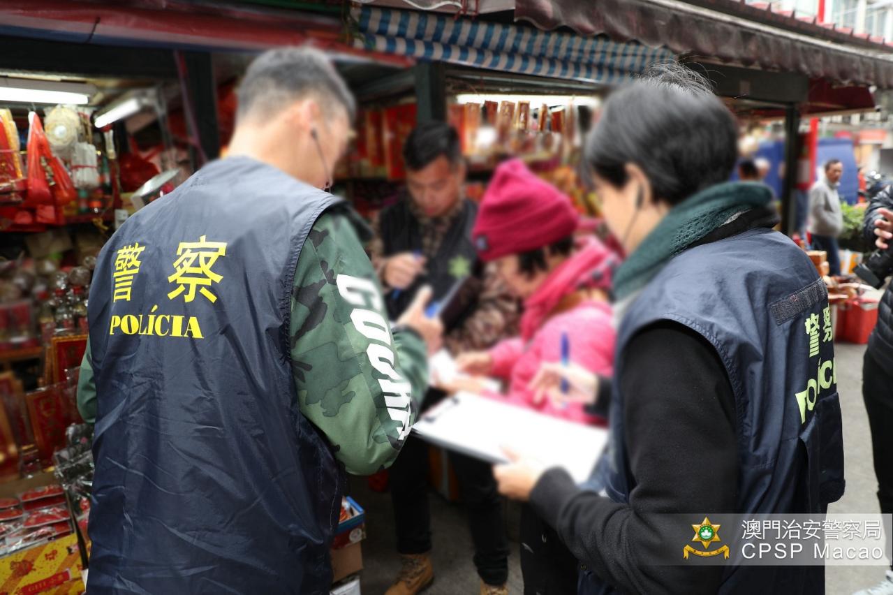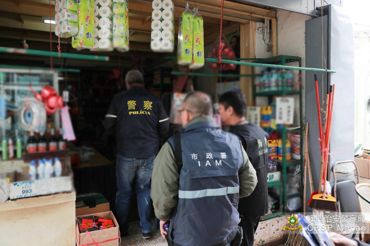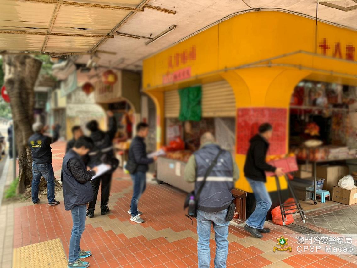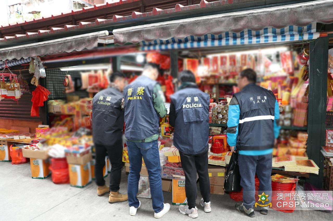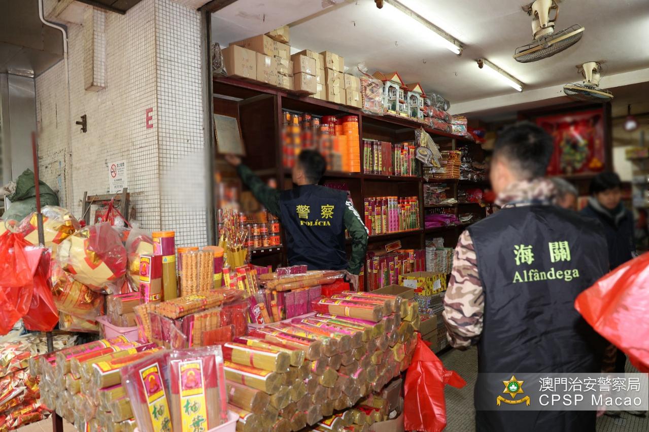 1月21日,治安警察局联同澳门海关及市政署进行打击非法入口、贮存及贩卖爆竹的联合稽查行动,巡查本澳各间售卖爆竹之店铺。是次行动共派出33人,巡查了48间店铺,截查58人(其中54人持有澳门居民身份证、4人持有外地雇员身份认别证),期间没有发现非法入口、贮存或贩卖爆竹的店铺,惟当中发现20间店铺占用公共地方摆卖货品,市政署人员对相关店铺作出票控。