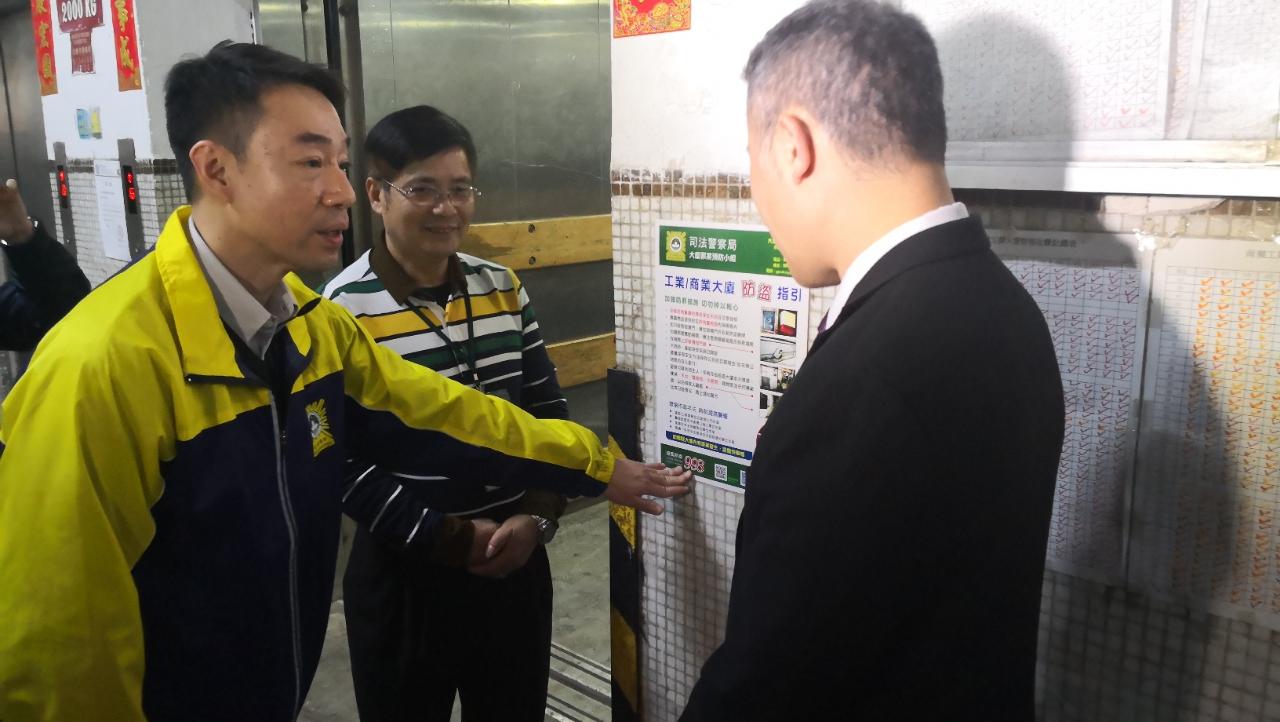 农历新年期间,不少工商业机构会暂停办公,工业及商业大厦内人流减少,保安措施容易被忽略,贼人可能会趁机作案。司警局大厦罪案预防小组联同大厦防罪之友会员率先巡查北区32幢工业大厦,与管理员交流近期的治安讯息,还向他们派发防骗防盗宣传单张,协助他们检视工厦的治安漏洞;提醒管理员在节假日期间加强巡逻,提高警觉,特别留意有否可疑人士进出大厦,如有异常情况应马上与警方联系,以防罪案发生。