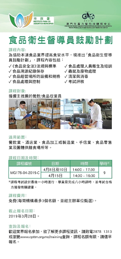 四月份「食品卫生督导员课程」现正接受报名,报名日期至三月二十八日,欢迎有兴趣的食品业界参加。有关课程资讯或报名详情可浏览市政署食品安全资讯网www.foodsafety.gov.mo、澳门生产力暨科技转移中心网站www.cpttm.org.mo/training,或致电2878 1313查询。