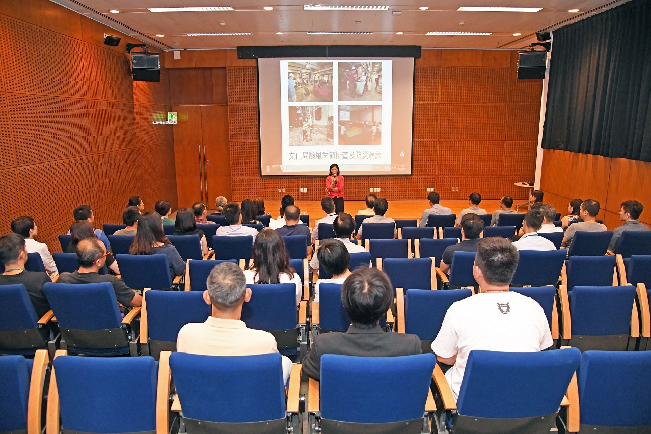文化局设有防灾应变机制,今年从4月起已对大部分文化设施启动有关机制,以防患于未然。是次防灾工作年度会议,由辖下多个部门不同工作范畴的设施管理代表就应对台风的预防措施进行分享,如低洼地区文物建筑之支援、仓库防灾改进措施等。演练项目除了文化中心综合体的排水系统清理、水泵等设备的测试、挡水沙包堆迭等,还包括博物馆藏品紧急撤离操练。透过经验分享和实地演练,有助提高文化局各部门演员的防灾应变的意识和能力。
