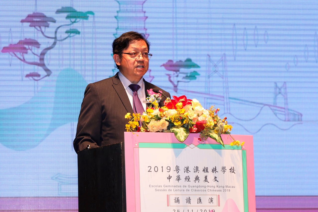 为庆祝澳门回归祖国二十周年,进一步推动粤港澳大湾区在教育、语言及文字上的交流合作,深化三地师生对祖国悠久历史的理解,弘扬中华文化,由广东省教育厅、澳门特别行政区政府教育暨青年局、香港特别行政区政府教育局及广东省语言文字工作委员会主办,香港教育工作者联会及澳门中华教育会协办的“2019粤港澳姐妹学校中华经典美文诵读汇演"于2019年11月25日(星期一)下午在圣保禄学校礼堂顺利举行。