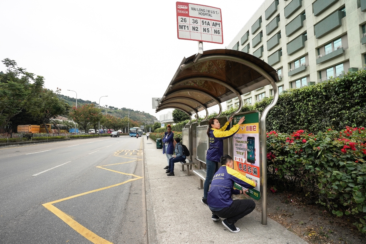 司警局表示,针对近期电话诈骗案频发且被害人多为本澳大专学生此一特点,局方已展开针对性的防罪宣传教育工作,早前与大专院校合作举办提防电话诈骗讲座、派员走访校园宣传防骗,以及透过青年常接触的网络社交媒体进行更广泛的宣传。近日,司警局人员到多间大学校园周边的巴士站进行提防电话诈骗宣传,向候车乘客讲解近期出现的电话诈骗手法和防骗方法,并在交通事务局协助下,在巴士站内张贴大型防骗宣传海报。