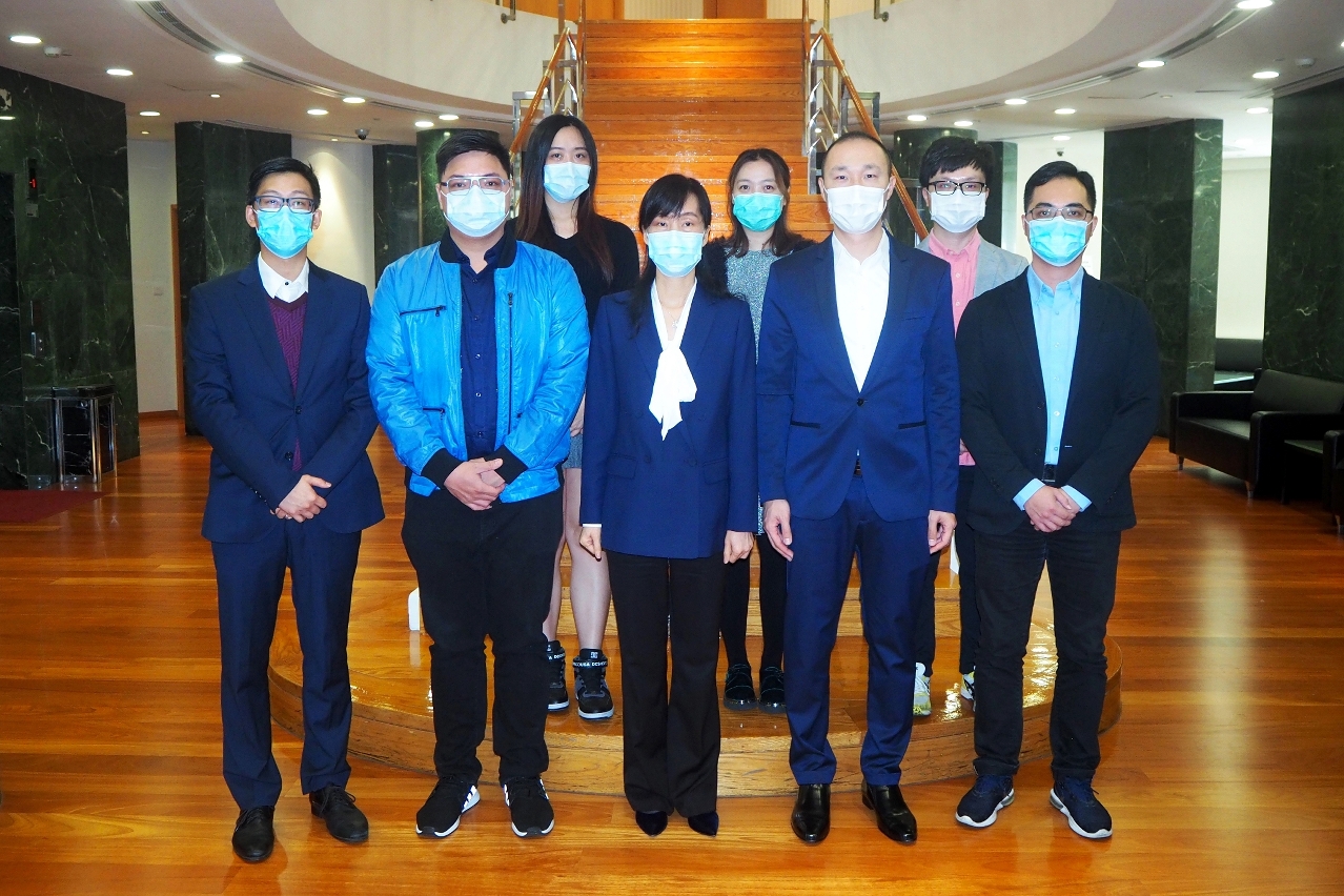 欧阳瑜司长(中)与出席捐赠仪式的澳门新口岸青年义工协会会长林家全(右二)、理事长谭震霖(左二)等合影