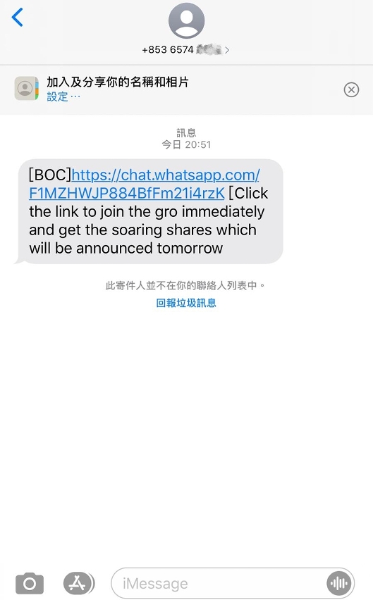 本局近日接获多名市民反映,称其手机接收到由本地手机电话号码发出的一条短讯,内容为:“[BOC]https://chat.whatsapp.com/F1MZHWJP884BfFm21i4rzK [Click the link to join the gro immediately and get the soaring shares which will be announced tomorrow”(“BOC"意指一间本地银行),大致意思为点击短讯内连结便可得到将大幅上涨的股票股份,本局接报后已向相关银行查证,确认其从未向市民发出过上述短讯,怀疑涉及电讯诈骗。