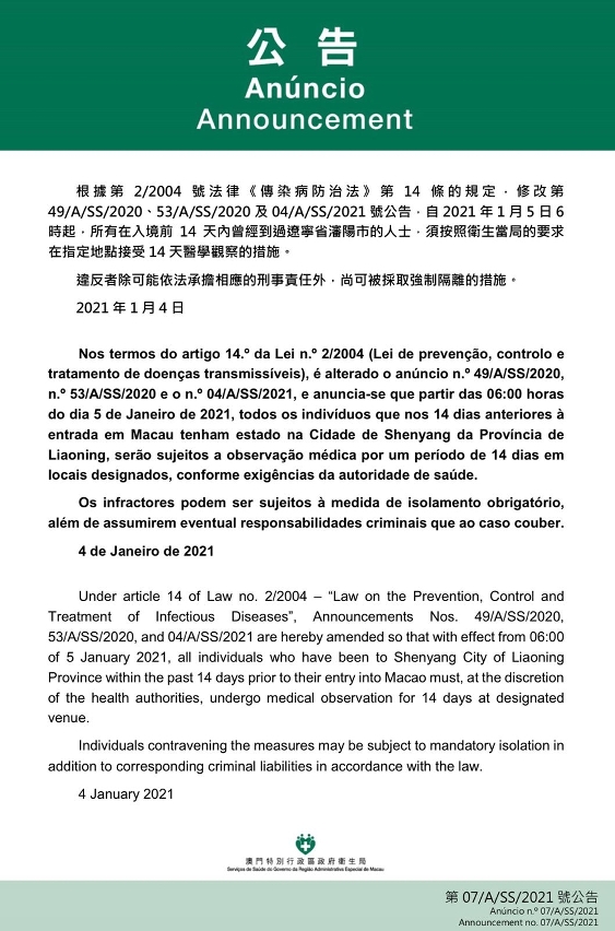 新型冠状病毒感染应变协调中心宣布,因应辽宁省的最新疫情发展,卫生局根据第2/2004号法律《传染病防治法》第14条的规定,自2021年1月5日早上6时起,所有在入境前14天内曾经到过辽宁省沈阳市的人士,须按照卫生当局的要求在指定地点接受14天医学观察,违反者除可能依法承担相应的刑事责任外,尚可被采取强制隔离的措施。