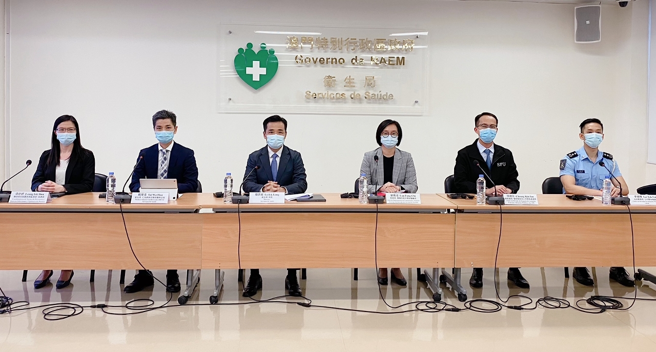 新型冠状病毒感染应变协调中心(下称应变协调中心)于今(27)日举行记者会,卫生局罗奕龙局长、仁伯爵综合医院戴华浩医务主任、旅游局传播及对外关系厅刘凤池厅长、警察总局警务联络及公共关系处张健欣处长、治安警察局公共关系处李德辉处长、疾病预防控制中心传染病防制暨疾病监测部梁亦好协调员共同会见传媒。