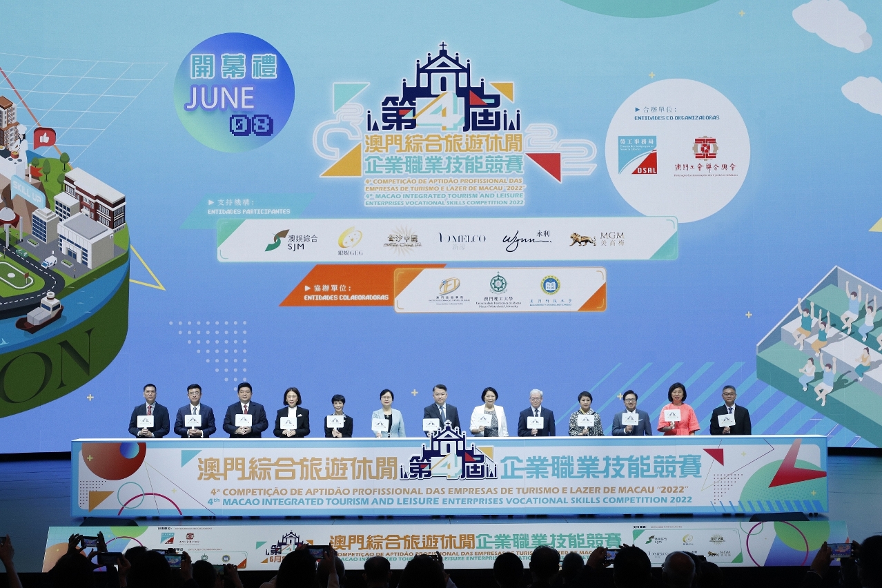 由劳工事务局与工联总会合办的「2022第四届澳门综合旅游休闲企业职业技能竞赛」,假美狮美高梅剧院举行启动仪式,其后将进行三项共五类赛事。是次竞赛旨在推动特区政府和企业重视对雇员职业素养和能力的培育,增强雇员的职业综合能力,为推动澳门特区整体发展,以及综合旅游休闲服务职技水准和素质提升作贡献。