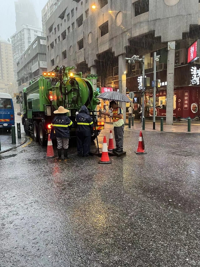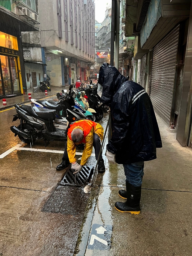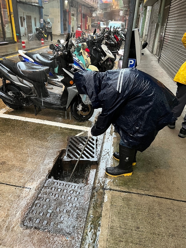 市政署启动暴雨紧急应变机制,今早已派员到各水浸易发地点巡查,清理路边雨水井冲积的垃圾,并持续检视泵房的正常运作,保障渠道排洪能力,尽力纾缓及减低水浸的情况。