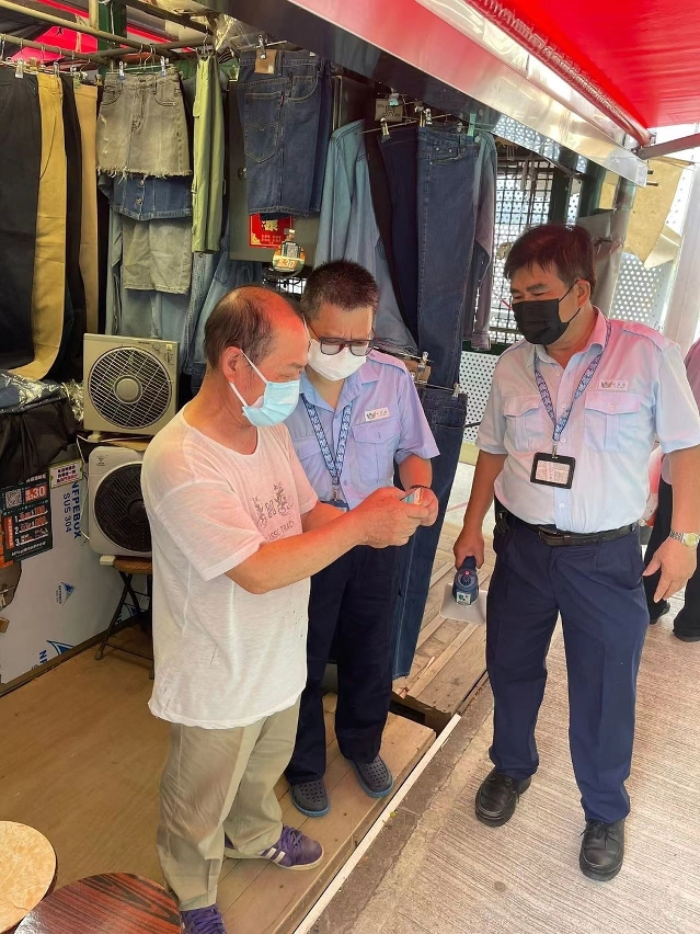 市政署要求各街市、小贩区的摊贩每天必须完成快速抗原检测,才能营业,稽查人员持续加强巡查。同时,并在各街市及小贩区持续播放防疫宣传信息,呼吁大众配合防疫工作,减少聚集。驻守街市门口的保安员亦为进入的居民提供消毒酒精,以进一步加强防护工作。