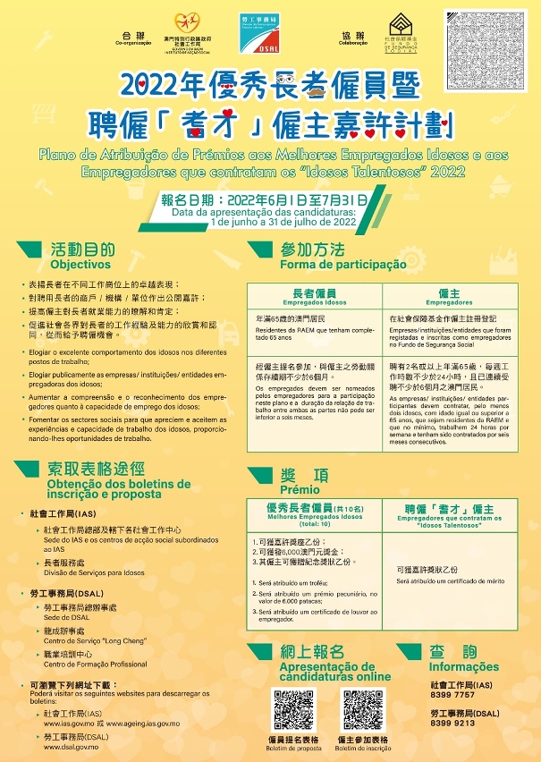 “2022年优秀长者雇员暨聘雇「耆才」雇主嘉许计划”专页网址:https://www.dsal.gov.mo/zh_tw/standard/news_detail/article/l33xvm38.html