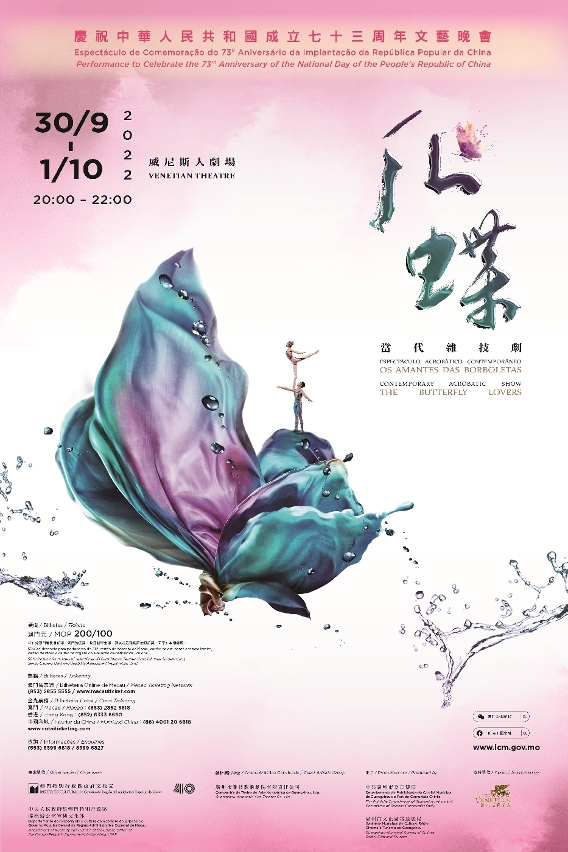 由澳门特别行政区政府文化局与中央人民政府驻澳门特别行政区联络办公室宣传文化部主办,中共广州市委宣传部与广州市文化广电旅游局出品,澳门威尼斯人支持,并由广州市杂技艺术剧院有限责任公司担演的“庆祝中华人民共和国成立七十三周年文艺晚会—当代杂技剧《化‧蝶》”,将于9月30日及10月1日晚上8时在威尼斯人剧场上演,藉着精湛杂技剧演出与市民欢度国庆,门票于本周五(9月2日)起公开发售。
