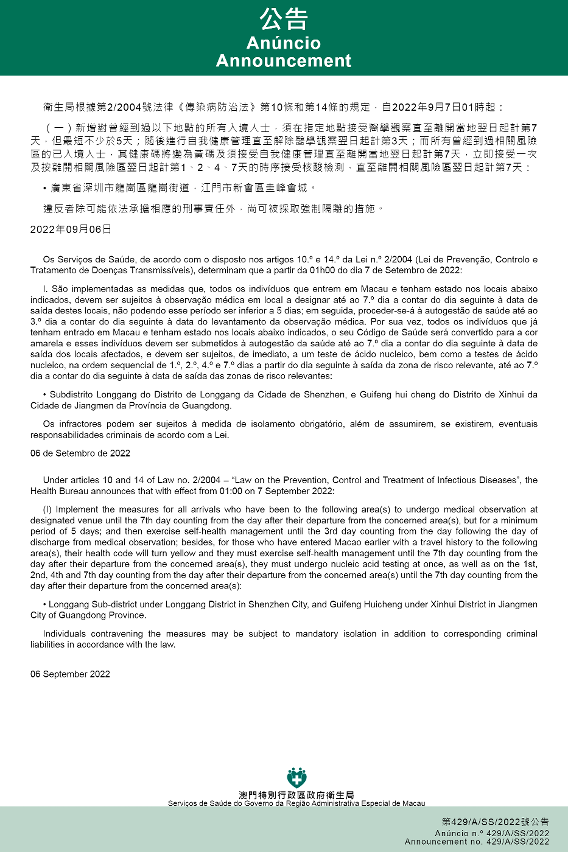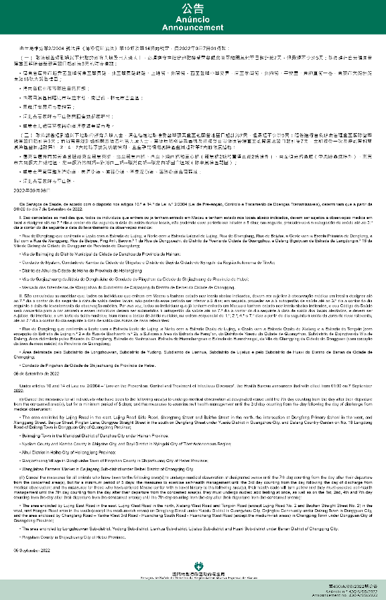 新型冠状病毒感染应变协调中心(下称应变协调中心)宣布,因应内地的疫情变化,卫生局根据第2/2004号法律《传染病防治法》第10条和第14条的规定,自2022年9月7日凌晨1时起,新增或取消对曾到内地相关区域人士的防疫措施: