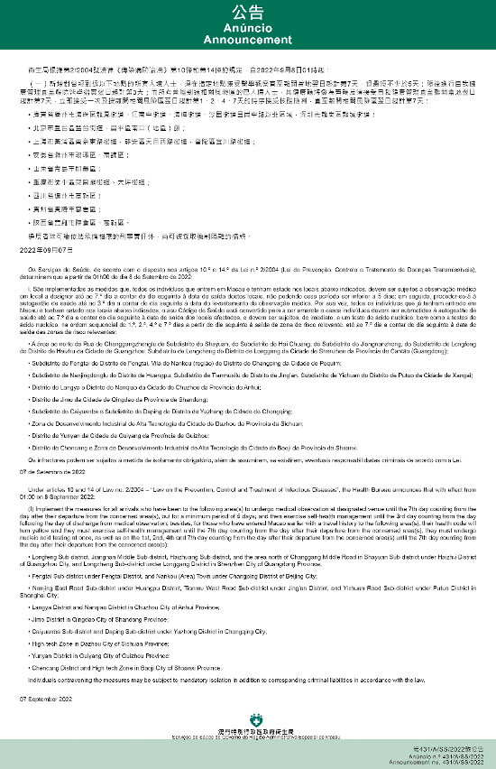 新型冠状病毒感染应变协调中心(下称应变协调中心)宣布,因应内地的疫情变化,卫生局根据第2/2004号法律《传染病防治法》第10条和第14条的规定,自2022年9月8日凌晨1时起,新增或取消对曾到内地相关区域人士的防疫措施: