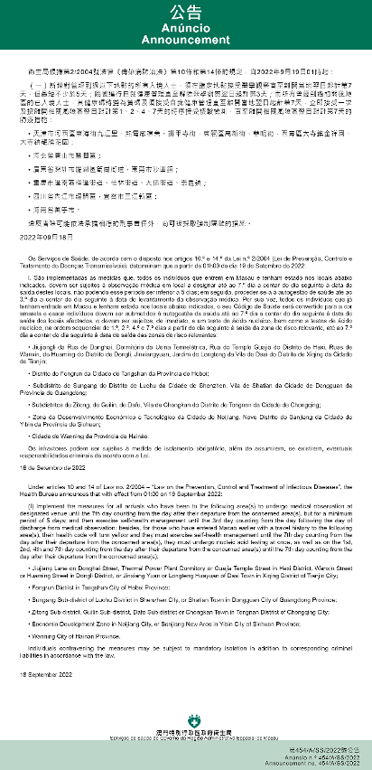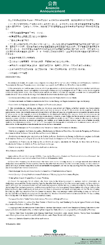 新型冠状病毒感染应变协调中心(下称应变协调中心)宣布,因应内地的疫情变化,卫生局根据第2/2004号法律《传染病防治法》第10条和第14条的规定,自2022年9月19日凌晨1时起,新增或取消对曾到内地相关区域人士的防疫措施: