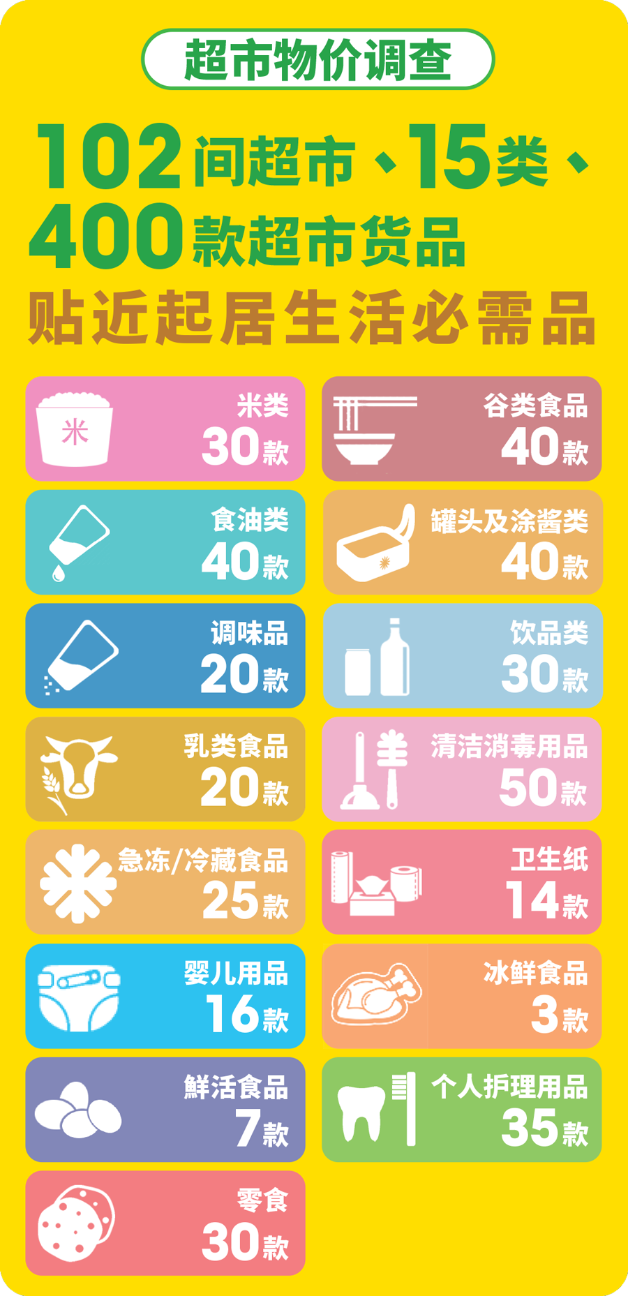 消委会持续加强物价调查工作,今年第3次调升超市及货品的调查数量,由本周起调查超市数量由45间,大幅增加逾一倍至102间,新增“零食”及“个人护理用品”两类货品,连同食米、谷类食品、食油、罐头及涂酱类、调味品、饮品、乳类食品、清洁消毒用品、急冻或冷藏食品、鲜活食品、卫生纸、冰鲜食品及婴儿用品共15类货品,调查货品数量增加多100款,增幅超过三成,包罗400款与消费者生活息息相关的民生食用货品价格。