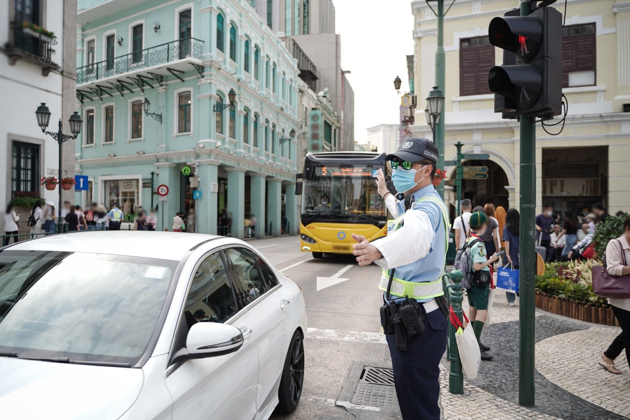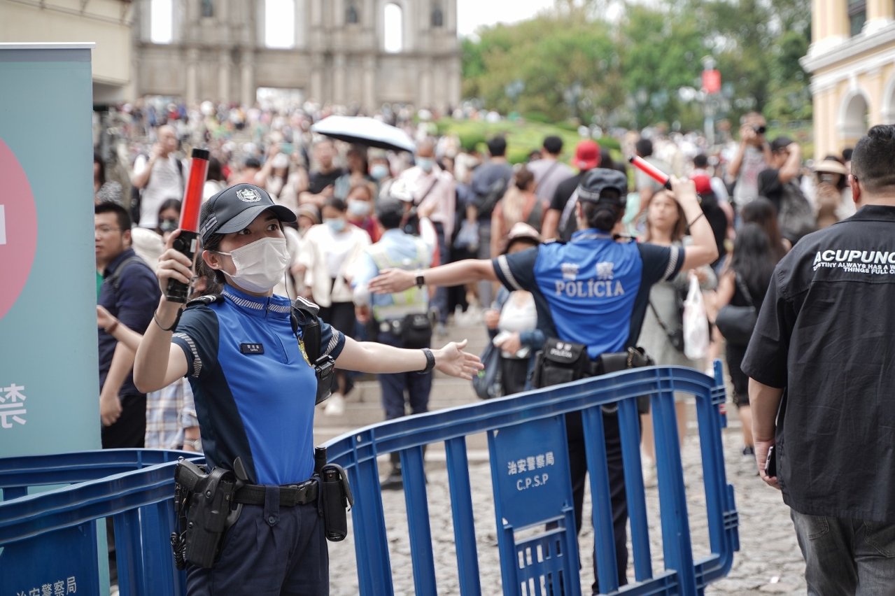 本局在黄金周期间密切关注各旅游热点的人流状况,其中新马路及大三巴一带游人络绎不绝;为疏导人流,本局加派警员到现场维持秩序,并先后于4月30日至5月2日三次在大三巴街实施人潮管制措施,市民及旅客均积极配合现场警员指示有序行进,整体秩序良好。