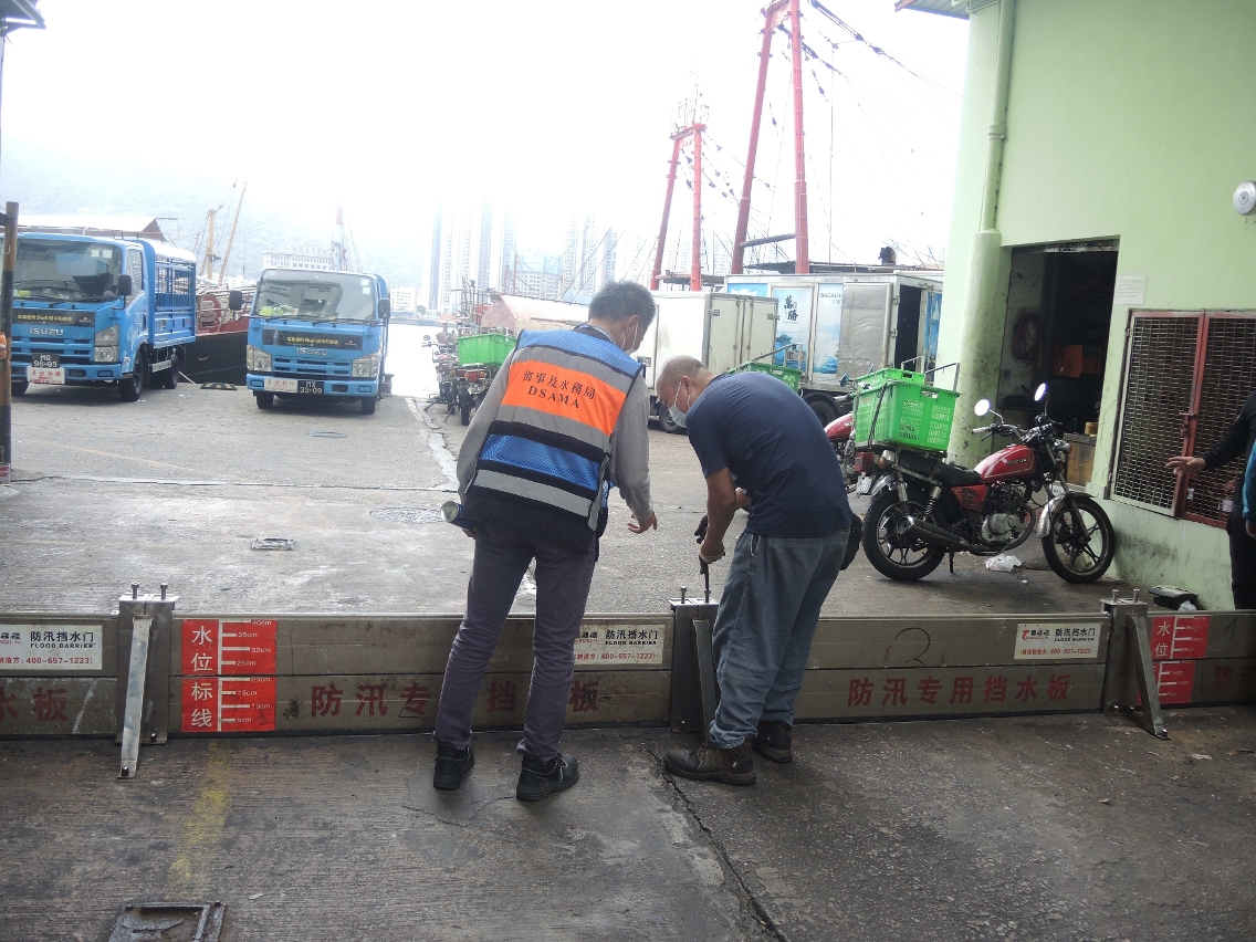为配合内港临时防洪工程之实施,海事局已与内港各码头建立完善的预警紧急通报机制。当气象局发出黄色或以上的风暴潮警告,海事局会通知内港码头安装防水旱闸挡水板。