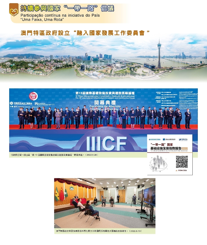 澳门特区积极参与国家“一带一路”倡议,持续与“一带一路”沿线国家和葡语系国家加强联系,并与内地各省市及香港特区拓展更广泛交流与合作,携手共谋发展。