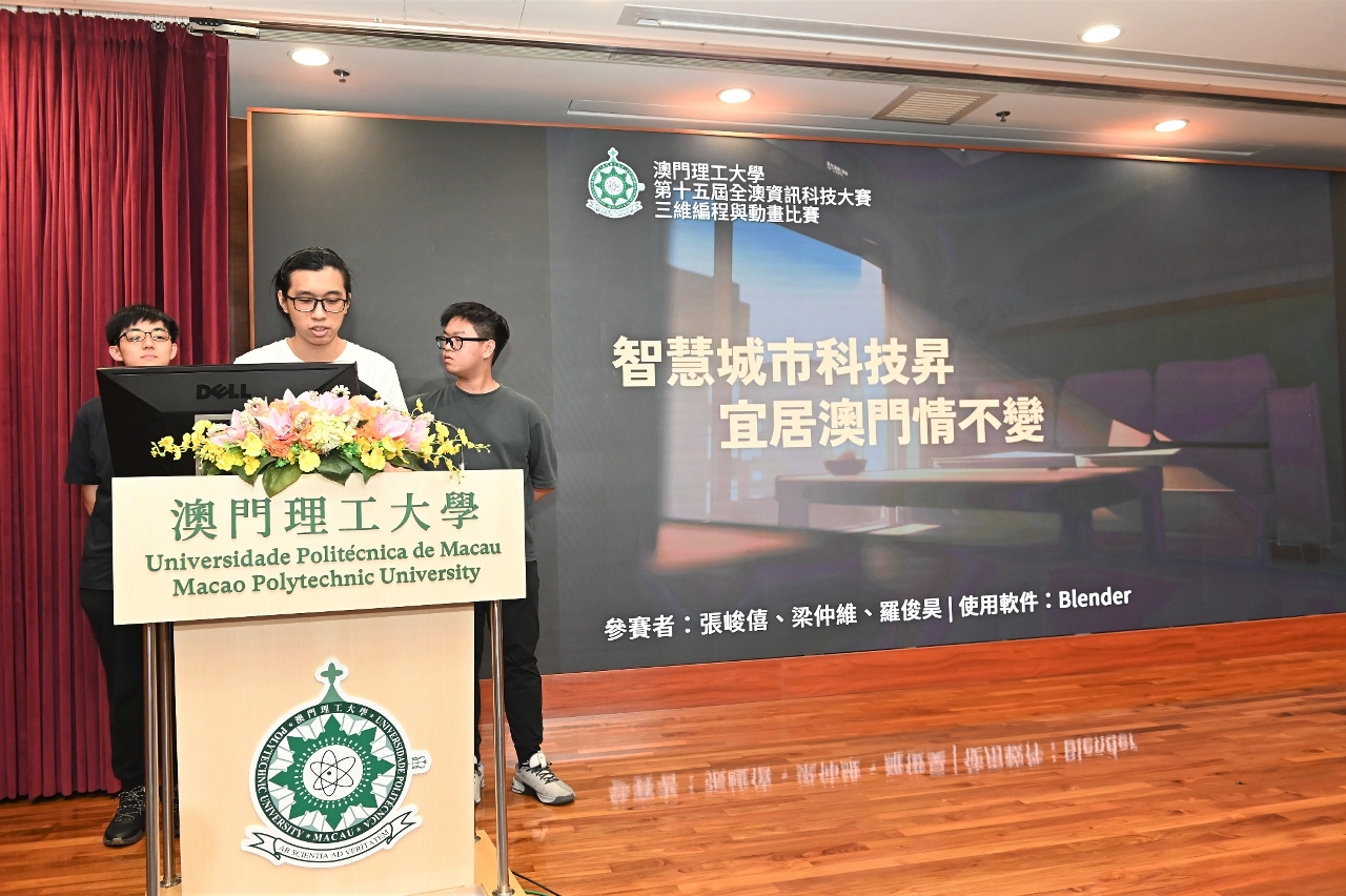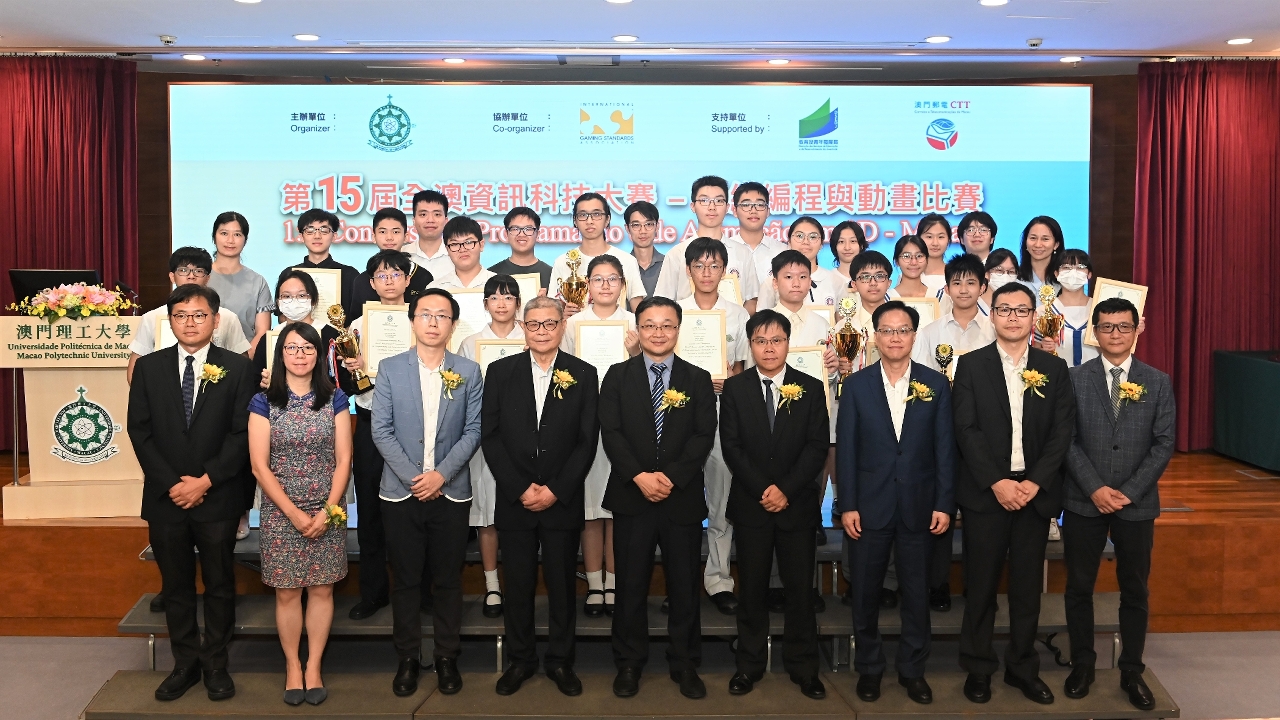 由澳门理工大学主办、国际博彩标准协会(iGSA)协办、澳门特区政府教育及青年发展局和邮电局支持的“第十五届全澳资讯科技大赛–三维编程与动画比赛"颁奖礼于日前在澳门理工大学举行,由澳门理工大学应用科学学院代院长林灿堂、广东省工程师学会荣誉会士暨澳门电脑学会会长温锦明、邮电局资讯科技发展及资源管理厅代厅长李广亮、教育及青年发展局教育资源厅职务主管林剑辉、培正中学校长高锦辉、利玛窦中学校长张慧玲、澳门菜农子弟学校副校长江钦育等主礼。本届比赛报名踊跃,有过百队参赛队伍报名参赛。