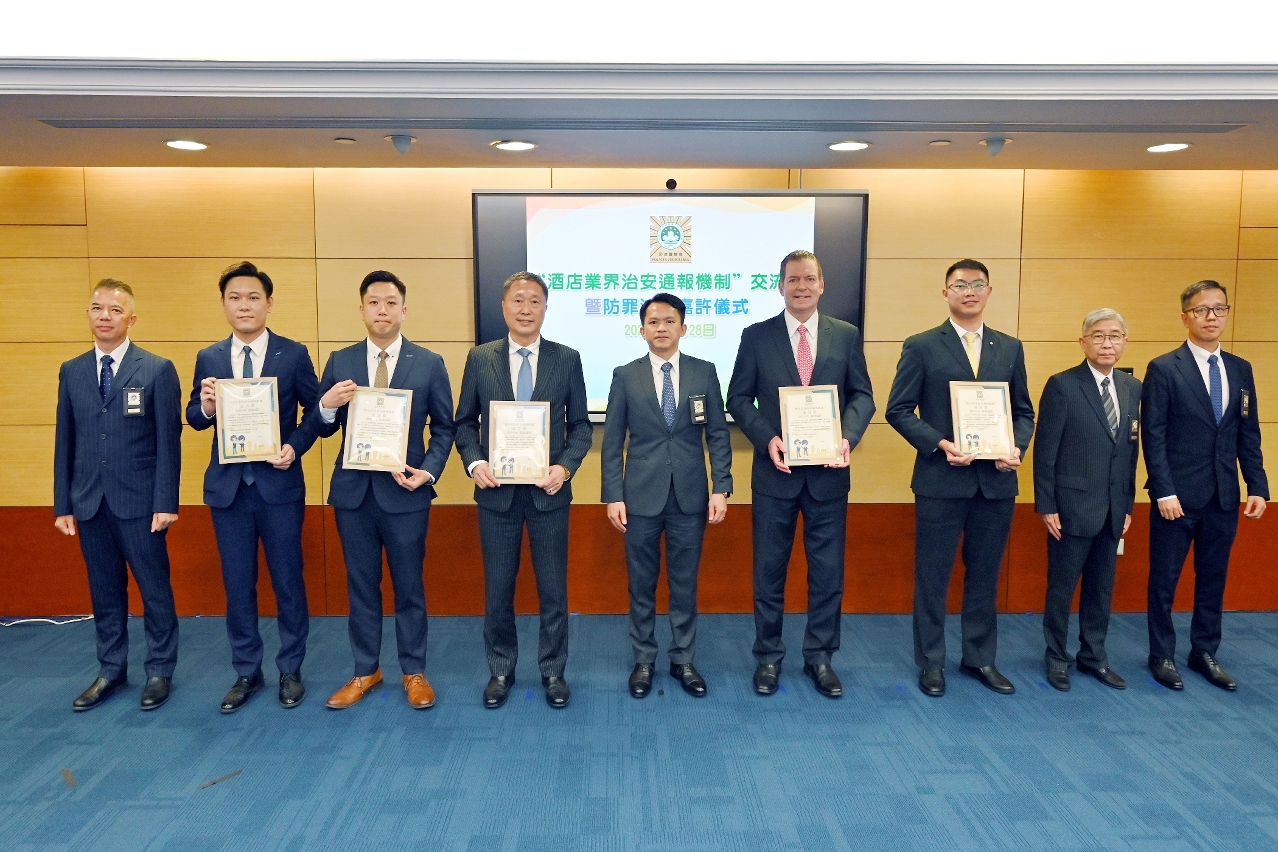 会上,司警局亦向5间酒店颁发嘉许状,以表扬他们主动提供治安讯息、积极配合警方侦查工作,有效协助局方成功侦破于酒店内发生的凶杀、抢劫、禁锢、操纵卖淫、盗窃、电脑诈骗等罪案。