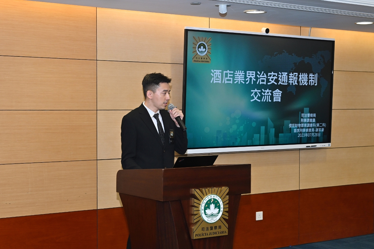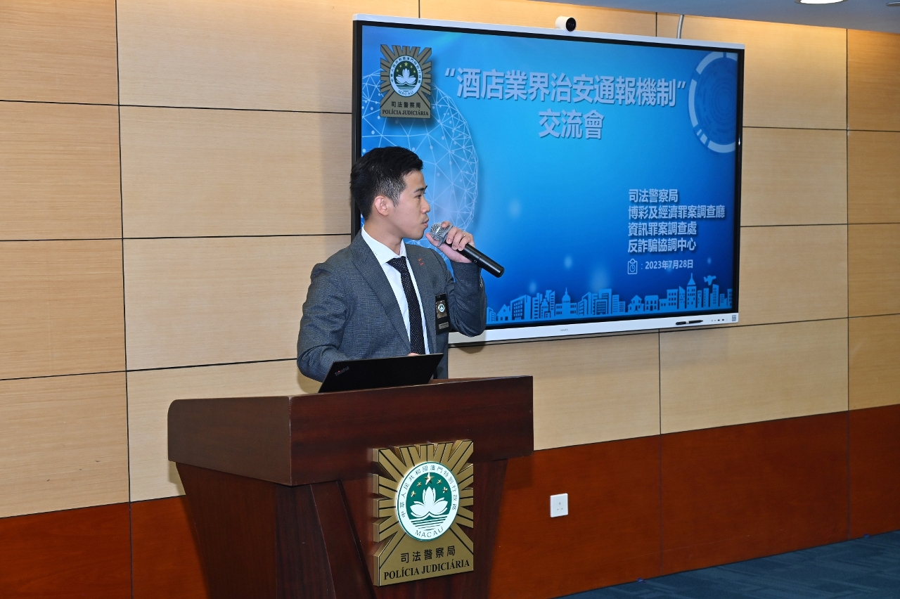 会议于7月28日下午3时在司警局总部大楼举行,司警局副局长苏兆强、刑事调查厅厅长薛专耀及多个刑事侦查部门主管出席会议,与来自71间本澳酒店的业界代表进行交流。