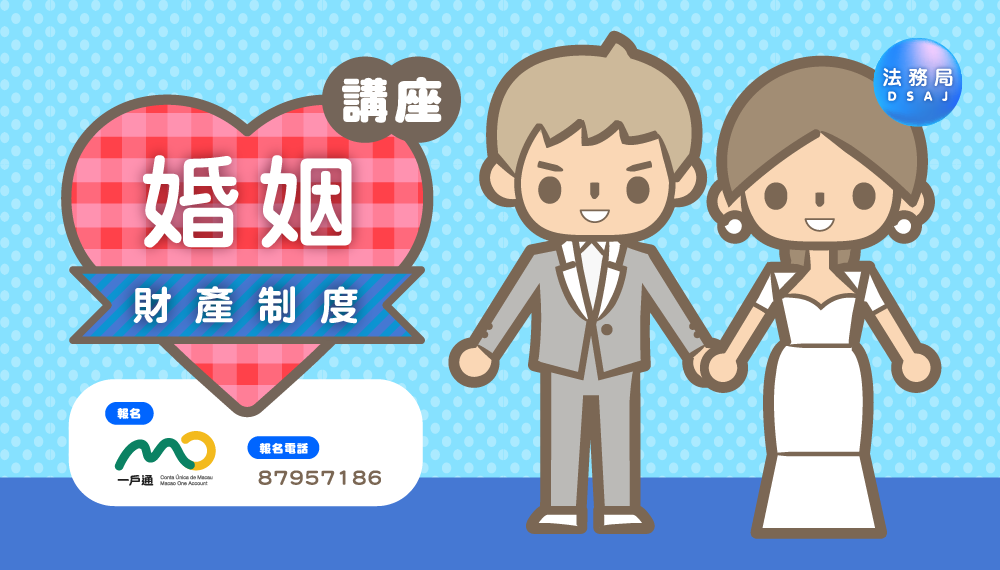 为让市民尤其是准婚人能了解澳门的婚姻财产制度,法务局每月举办“婚姻财产制度讲座”。 讲座除讲解《民法典》所规定的“分别财产制”、“一般共同财产制”、“取得共同财产制”和“取得财产分享制”四种婚姻财产制度的内容外,亦会讲解夫妻义务、婚姻协定及夫妻债务等内容。