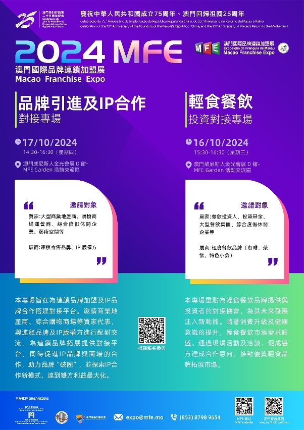 庆祝中华人民共和国成立75周年、澳门回归祖国25周年系列活动,“第二十九届澳门国际贸易投资展览会”(第29届MIF)联同“澳门国际品牌连锁加盟展2024”(2024MFE)将举办合共8场专题配对洽谈,为海内外展商客商创造“1+4”产业、中葡商贸、澳琴商机、国际连锁品牌、IP产业等领域经贸交流平台,助参与各方对接国际资源,开拓商脉。
