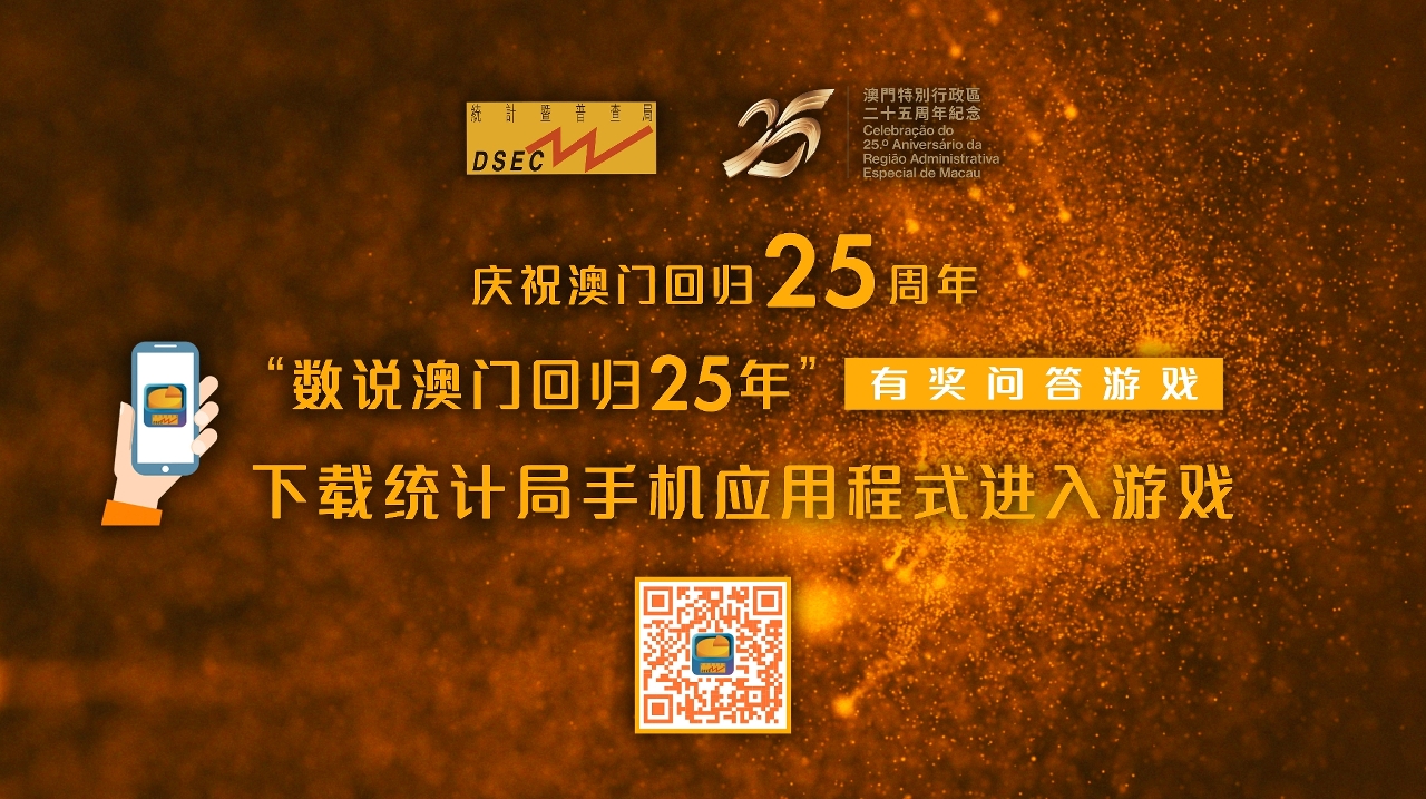 为庆祝澳门特别行政区成立二十五周年,统计暨普查局举办“数说澳门回归25年”有奖问答游戏与市民共贺回归,冀让大众透过游戏中的统计数据了解澳门回归以来社会及经济等方面的发展与变化。