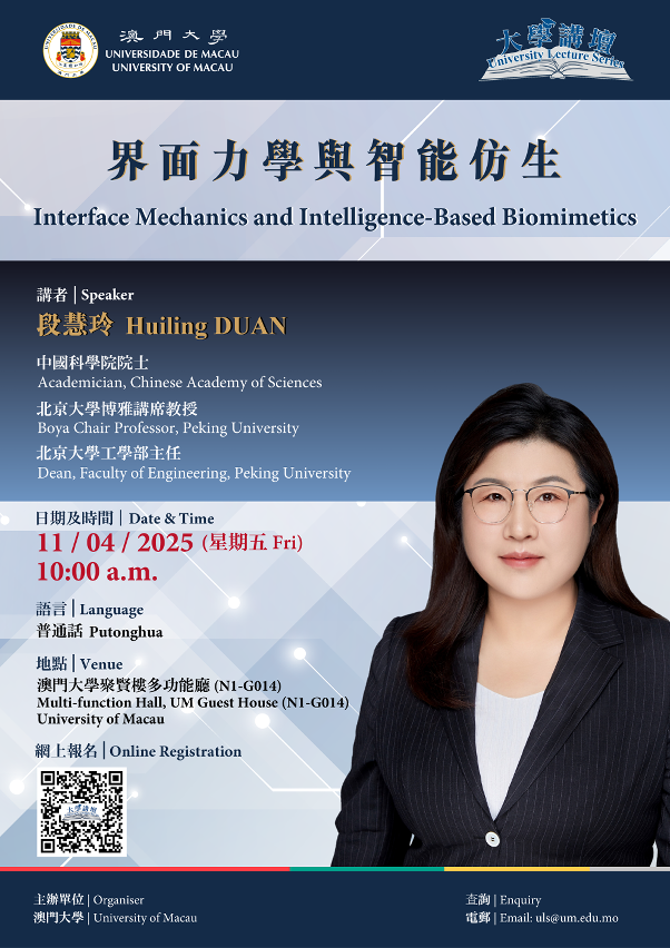 澳门大学将于4月11日(星期五)举办大学讲坛,中国科学院院士段慧玲将以“界面力学与智能仿生”为题发表演说,探讨界面力学与人工智能相结合及面向未来智能化的发展趋势。欢迎有兴趣人士参加。