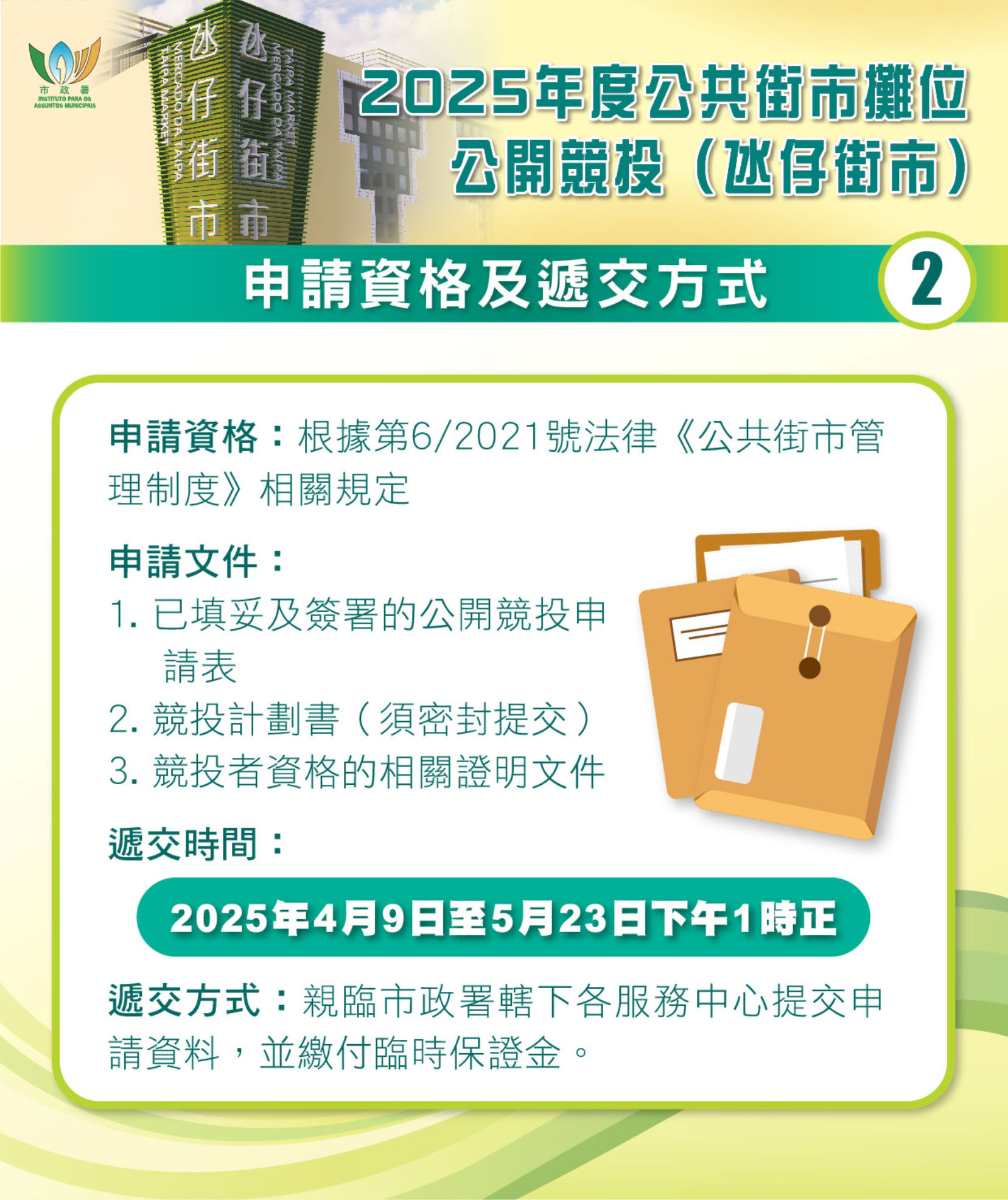 根据《公共街市管理制度》规定,以公开竞投方式招揽摊位承租人,有意竞投市民可按个人意愿撰写竞投计划书。竞投申请须符合相关资格及要求,每名竞投者只可递交1份申请表及竞投计划书。有意投标者可由即日起至5月23日中午1时正,亲临市政署辖下各服务中心递交申请表及竞投计划书等文件,同时须缴付临时保证金。