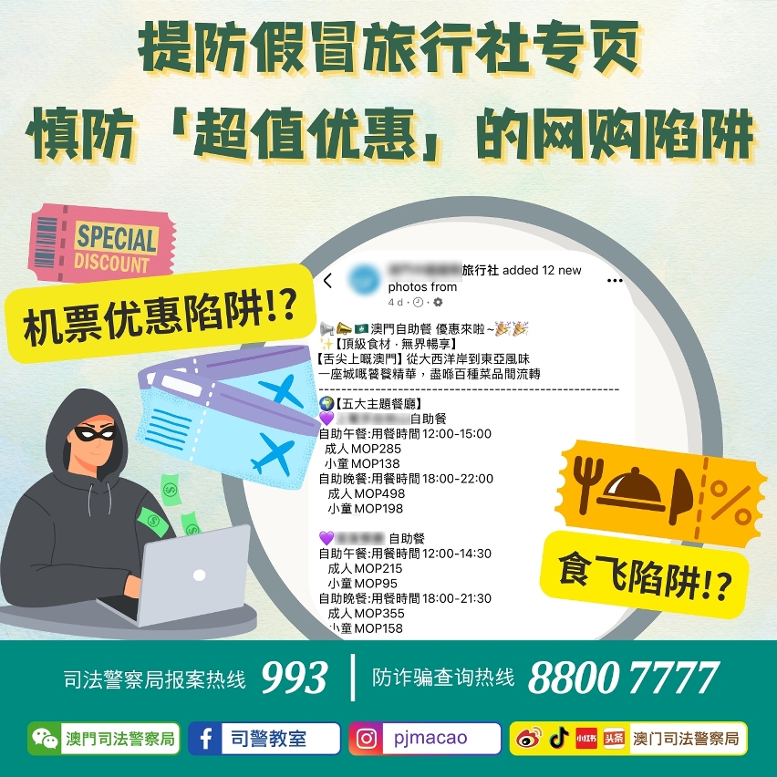 近日,司法警察局接获多宗有关「假冒旅行社」的诈骗举报。骗徒利用网上社交平台,假冒本澳多间旅行社开设虚假专页,并以广告形式发布帖文,声称出售「超值优惠」的机票或自助餐券,藉此诱骗有意购买的事主支付订金或全额费用。当事主向专页提供的银行帐户转帐后,便被对方加入黑名单,始发现被骗。