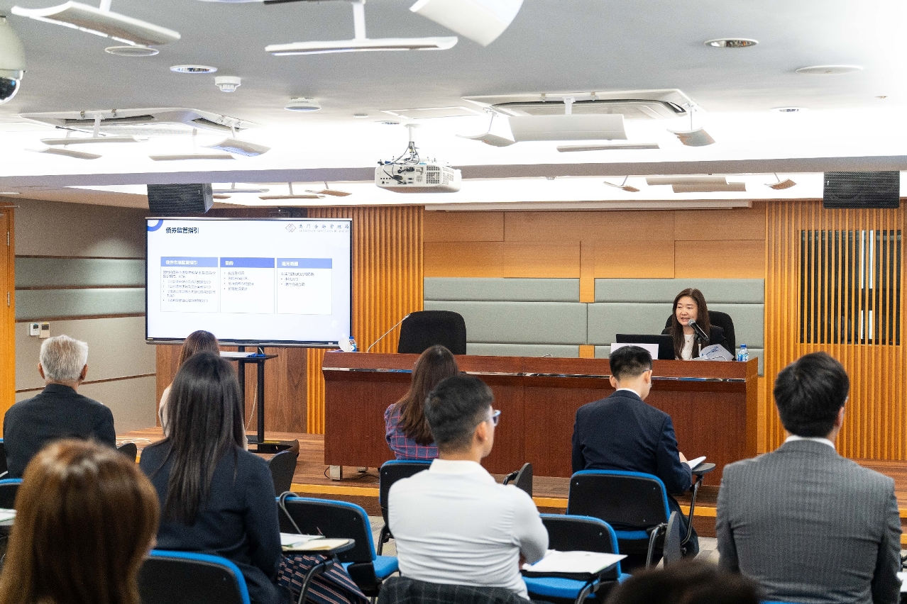 金管局代表于讲座上介绍澳门债券市场近年的发展历程和未来的发展方向,以及本地债券业务的监管制度,包括发行、登记结算、资讯披露、承销及受托等业务的监管指引,并透过具体案例说明债券发行流程及实务要点。此外,香港法律业界代表亦分享了国际及邻近债券市场在处理债券违约、清偿安排及应对措施的实践经验,并配合案例深入分析相关法律操作;在香港从事债券市场基建联通业务的机构代表则阐述内地及香港债券市场现况,以及两地债市互联互通下的交易模式和发展趋势。