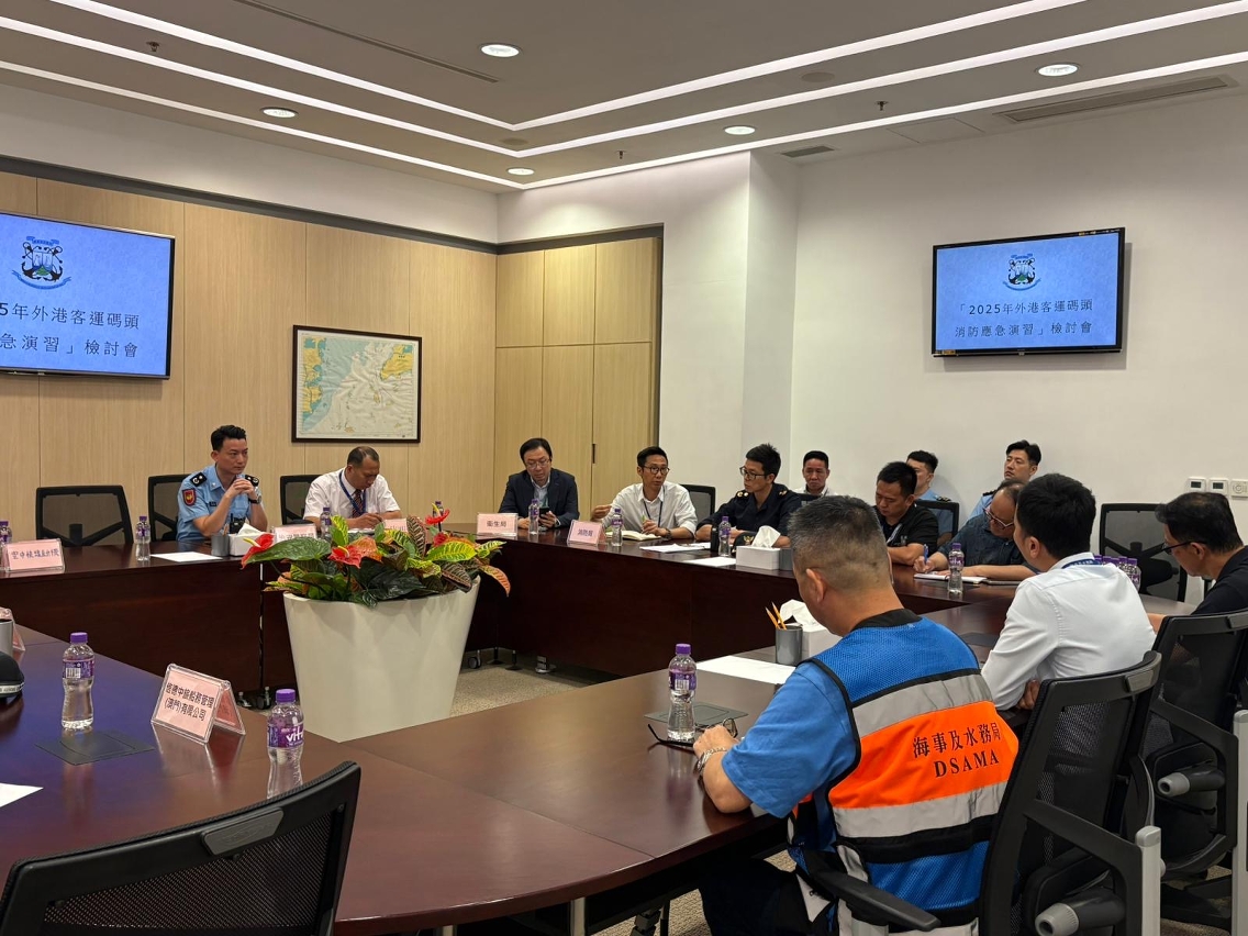 为加强外港客运码头内各营运单位对火警发生时疏散程序的了解和应变能力,保障码头内乘客及员工等人士的安全,海事及水务局今(12)日联同海关、治安警察局、消防局及卫生局在外港客运码头举行2025年度消防应急演习。