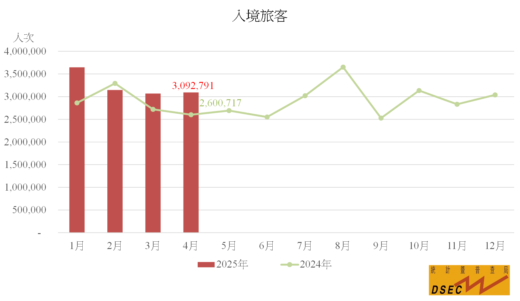 统计暨普查局资料显示,2025年4月入境旅客共3,092,791人次,按年上升18.9%。不过夜旅客(1,755,592人次)与留宿旅客(1,337,199人次)同比分别上升30.1%及6.9%。受不过夜旅客占比上升影响,旅客平均逗留时间按年减少0.1日至1.1日;不过夜旅客(0.2日)及留宿旅客(2.3日)的平均逗留时间维持不变。