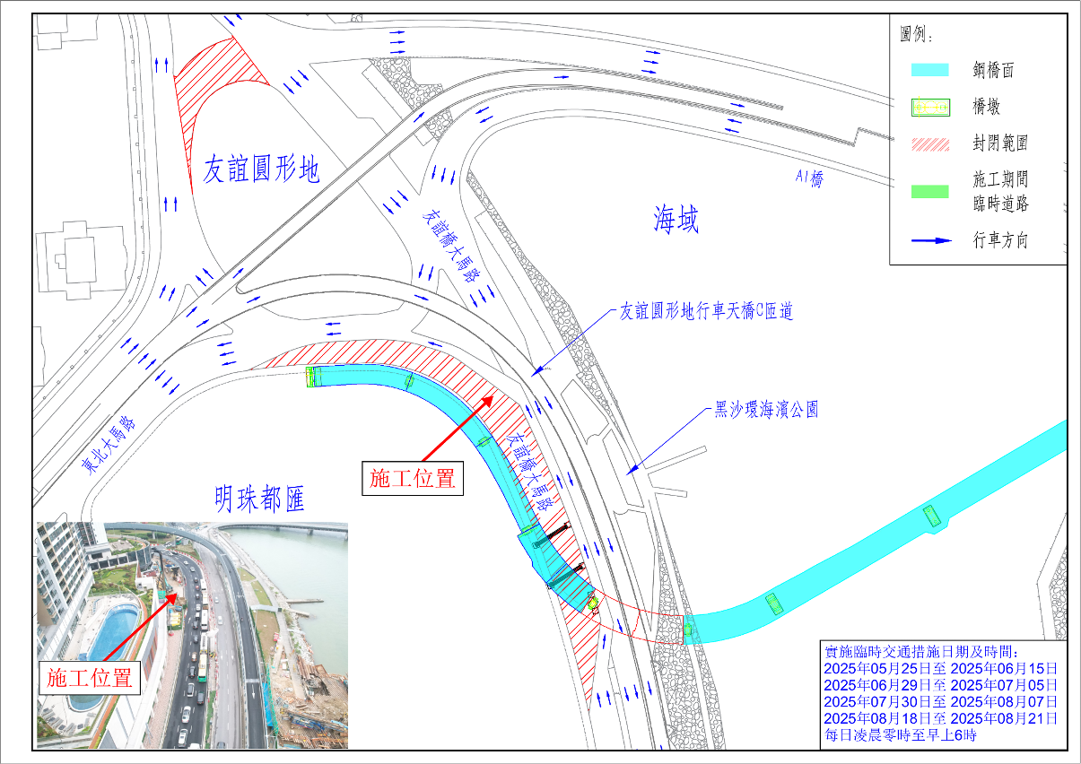 为配合友谊圆形地行车天桥第二期建造工程横跨友谊桥大马路上方一段的桥面吊装、防撞栏及相关配套设施安装、临时支撑及棚架拆除等工作,为保障行车安全,经跨部门协调,友谊桥大马路一带将于2025年5月25日至8月23日,每日凌晨零时至上午6时实施以下临时交通改道措施:
