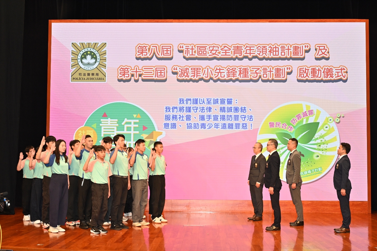典礼上,首先进行第七届“社区安全青年领袖计划”及第十二届“灭罪小先锋种子计划”结业仪式,共有241位学员顺利结业,司警局领导层和出席嘉宾向结业学员颁发结业证书,以及向127位表现优秀、积极参与防罪灭罪宣传和社会义务工作的学员颁发奖状。结业仪式结束后,随即举行第八届“社区安全青年领袖计划”及第十三届“灭罪小先锋种子计划”启动仪式。今年分别有来自本澳7所高等院校的100名大学生,以及来自42所中学的300名中学生参加防罪培训,在司警局领导层监誓和一众来宾见证下,学员由代表带领进行庄严宣誓,新一届青少年防罪培训计划正式启动。