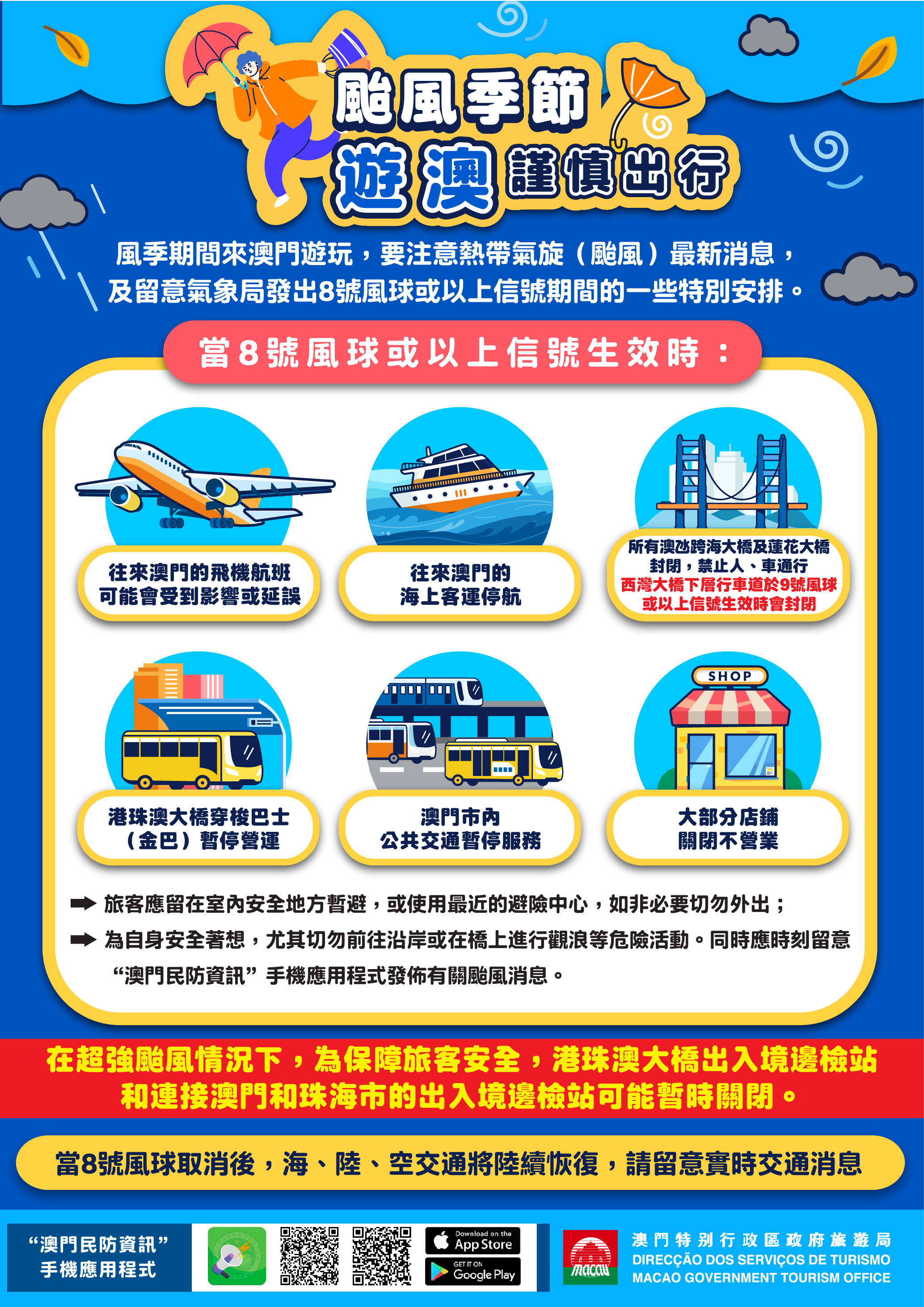 旅游局已向身处外地的澳门居民和在澳旅客发出有关悬挂8号风球的手机提示讯息,8号或以上风球期间所有公共交通服务暂停,呼吁旅客留在安全的地方。建议旅客密切留意澳门地球物理气象局网站www.smg.gov.mo/zh、新闻局网站www.gcs.gov.mo或下载“澳门民防资讯”手机应用程式以获取最新资讯及民防讯息。旅游局网页及社交平台亦有转载气象相关讯息。