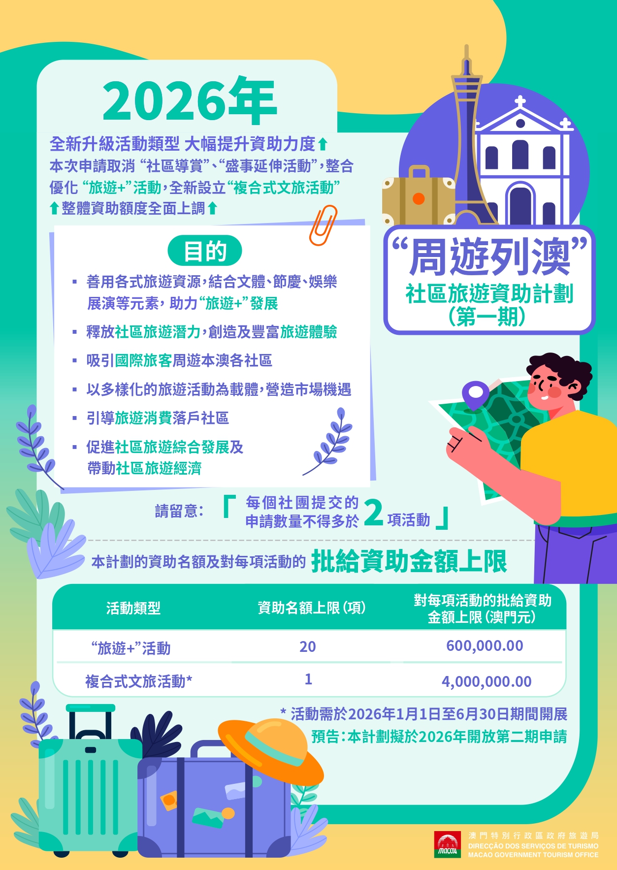 旅游局“周游列澳”社区旅游资助计划、“味历澳门”美食推广资助计划和“滨海游乐”海上旅游资助计划于2025年9月12日至10月3日接受申请,申请须以商社通实体使用者帐户登入旅游局“资助计划(2026年)”专页提交。旅游局将于9月11日举行线上讲解会,欢迎有兴趣的社团参加了解详情。