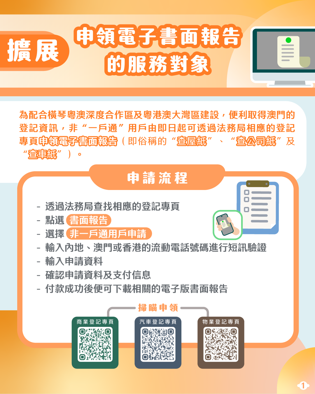 为配合横琴粤澳深度合作区及粤港澳大湾区的建设,便利内地及香港居民、政府或私人机构等取得澳门的物业、商业和汽车登记的资讯,法务局将申领电子书面报告(包括查屋纸、查公司纸及查车纸)的服务对象扩展至非“一户通”用户。申请人可于法务局的物业、商业及汽车专页内完成申请并付款,便可下载相关电子版书面报告,随时随地取得登记的最新资讯。