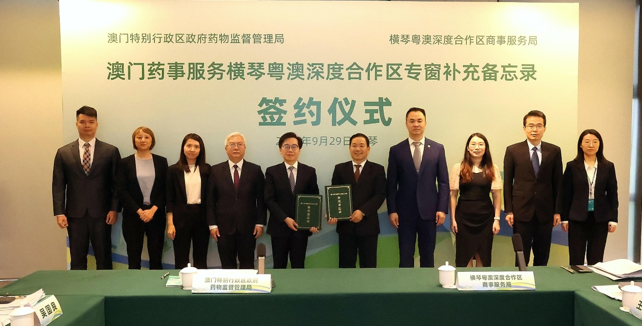 药物监督管理局与横琴粤澳深度合作区商事服务局于2025年9月29日,在合作区签署了《澳门药事服务横琴粤澳深度合作区专窗补充备忘录》,对“澳门药事服务横琴粤澳深度合作区专窗”(以下简称“专窗”)服务对象及内容进行拓展。药监局蔡炳祥局长、吴国良副局长及合作区商事服务局彭九如副局长等领导出席备忘录签署仪式。