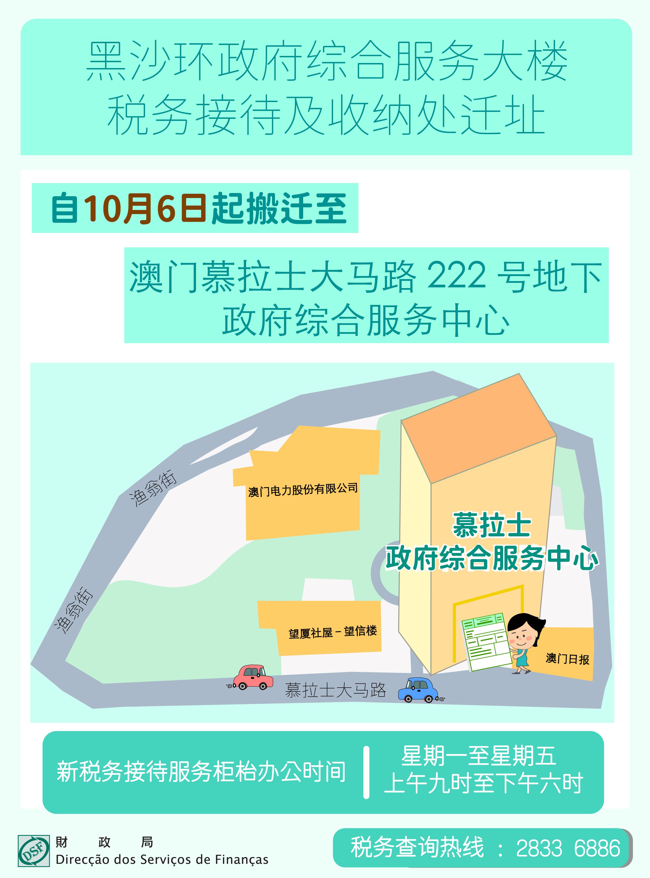 财政局位于澳门黑沙环新街52号政府综合服务大楼-税务接待及收纳处之最后办公日至2025年10月3日,并于2025年10月6日起迁往澳门慕拉士大马路 222 号地下之政府综合服务中心继续对外服务。