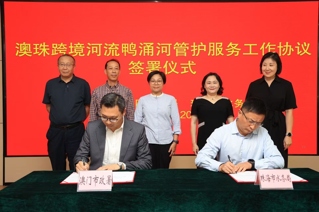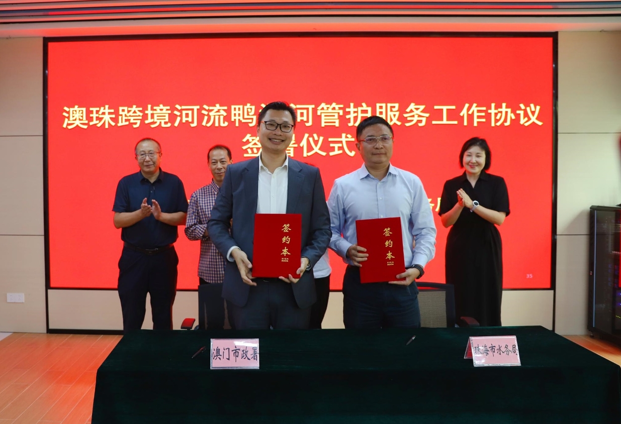澳门市政署市政管理委员会主席周伟迎一行与珠海市水务局党组书记、局长许蓓蕾一同考察了鸭涌河的水体及绿化管护情况,并共同签署《鸭涌河水体、河岸绿化及设施管理协议书》;根据协定,澳门市政署委托珠海市水务局,对鸭涌河的水体治理、河岸绿化养护及沉沙井等设施进行管护,加速“一河两岸”亲水生态景观长廊建设。另外,在广东省西江流域管理局、中共珠海市委台港澳工作办公室、珠海市生态环境局等单位代表的见证下,《鸭涌河跨境河流协同治理工作办法》亦同步启动实施。