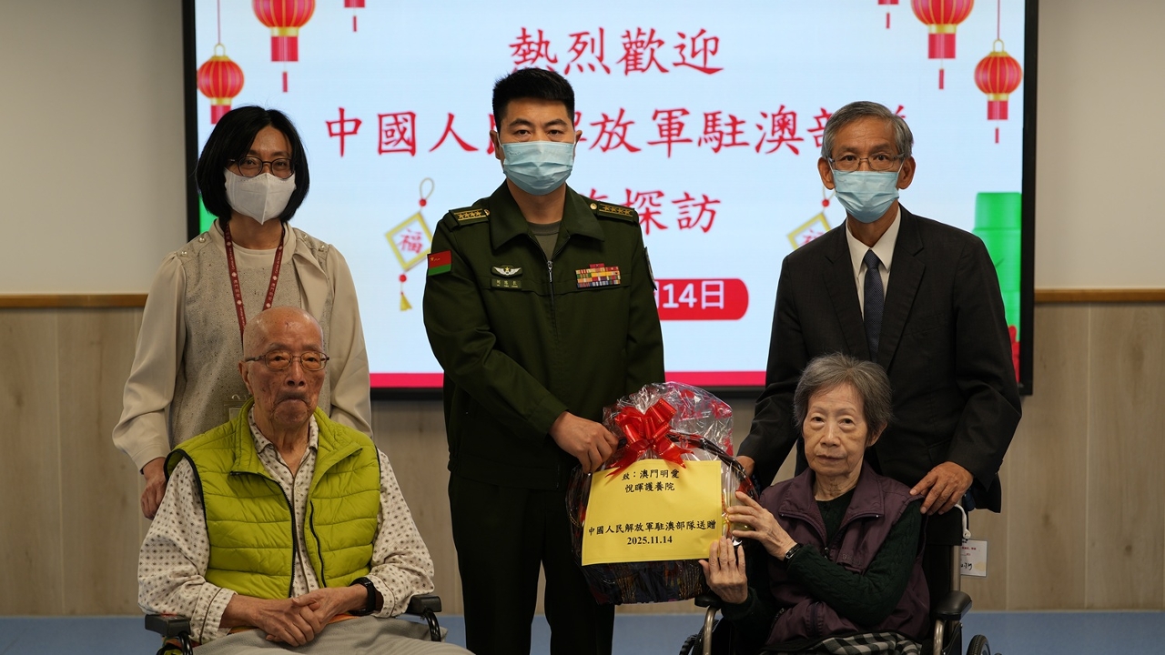 为感谢长者对本澳社会的贡献,弘扬敬老崇孝的社会价值,中国人民解放军驻澳门部队政治工作部副主任刘陈长与官兵代表,在澳门特别行政区政府社会工作局局长韩卫的陪同下,于11月14日下午到访澳门明爱属下的悦晖护养院探访及关怀长者。