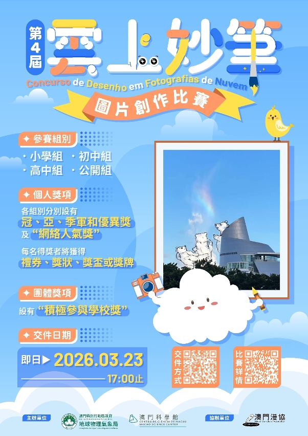 为推动气象科普教育,地球物理气象局联同澳门科学馆合办、澳门漫画从业员协会协办第四届“云上妙笔图片创作比赛”,冀提升公众对天气情况的关注和认识,以及对云种等气象知识的了解。比赛由即日起至2026年3月23日接受报名,欢迎合资格人士踊跃参与。