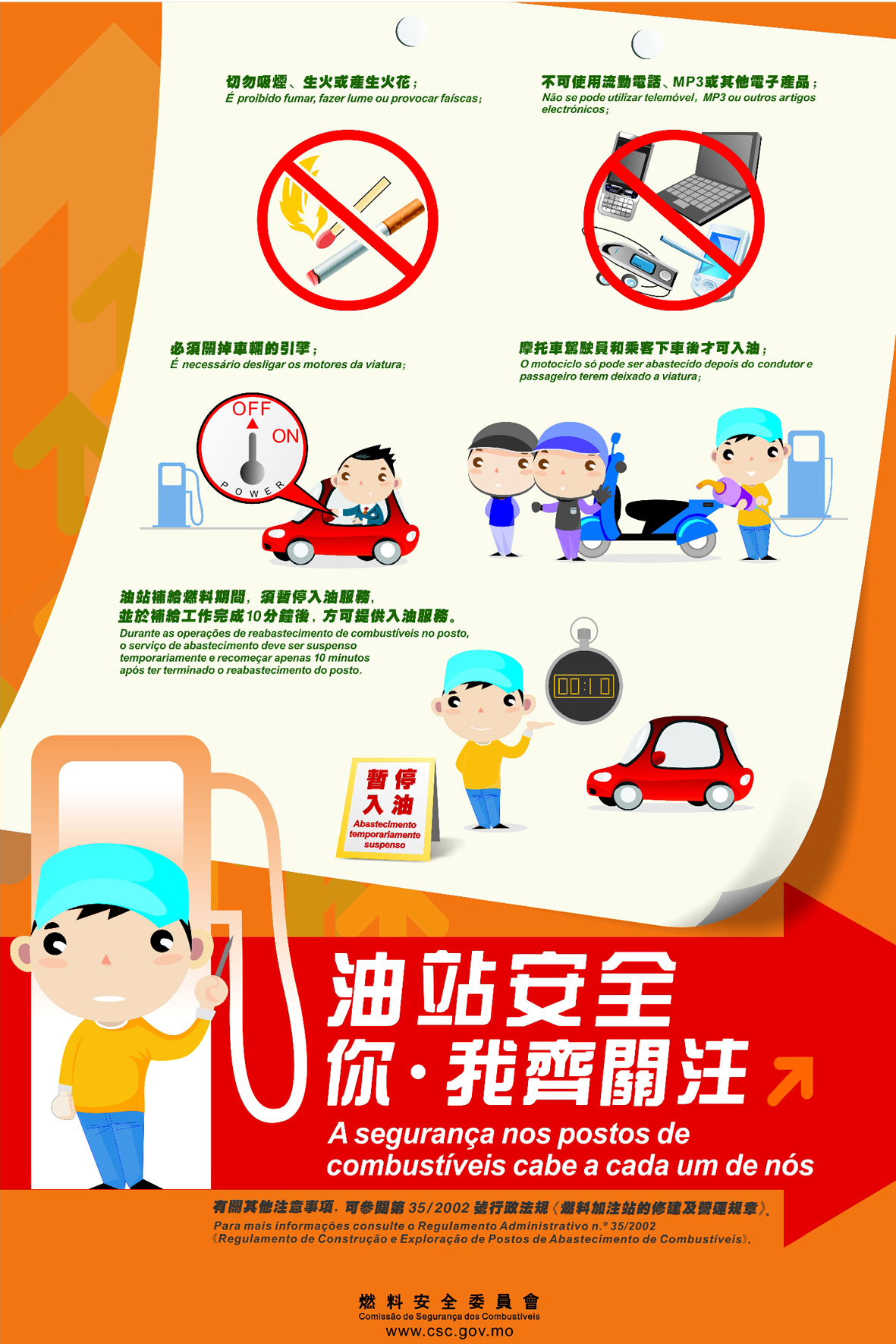 有關宣傳單張及海報的內容,主要對使用者進入油站及在補給燃料期間應注意事項作相關之介紹,達保障使用者和油站安全的目的。有關海報和單張將在各油站、公共部門及社會團體內張貼及派發,以方便市民取閱和知悉。同時,巿民亦可以瀏覽該會網頁http://www.csc.gov.mo獲悉相關之資訊及內容。