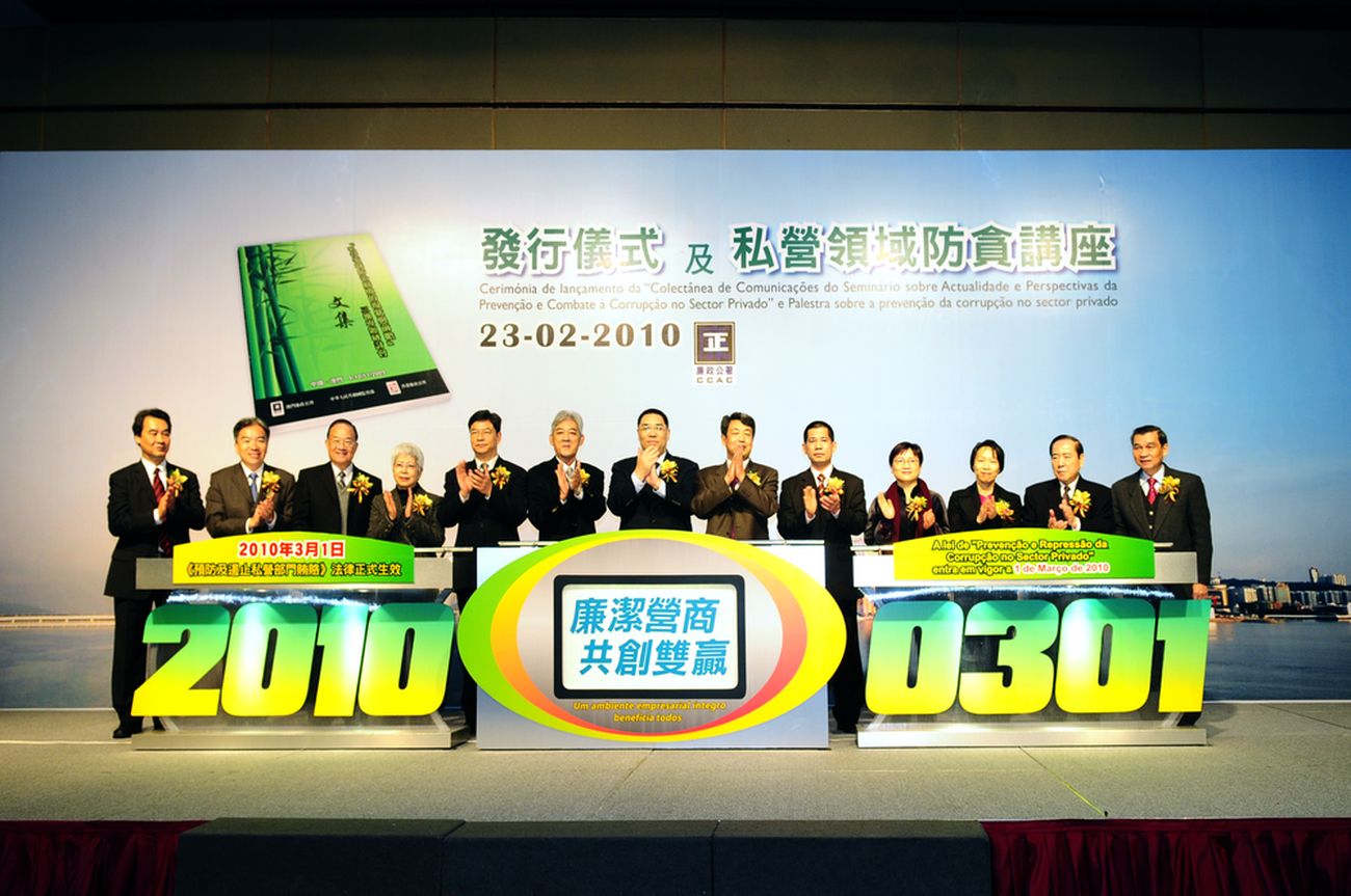 今早舉行的《「私營領域防治腐敗的現狀與前瞻」三地專題研討會文集》發行儀式,由行政長官崔世安、立法會主席劉焯華、國家預防腐敗局辦公室副主任于賢成、檢察長何超明、廉政專員馮文莊、澳門廉政公署人員紀律監察委員會委員林笑雲、香港廉政公署社區關係處處長穆斐文、可持續發展研究中心主任謝志偉、廉政公署助理專員杜慧芳、香港中華廠商聯合會會長黃友嘉、澳門中華總商會理事長許世元、澳門工會聯合總會理事長陳錦鳴及澳門街坊會聯合總會理事長姚鴻明擔任主禮嘉賓。